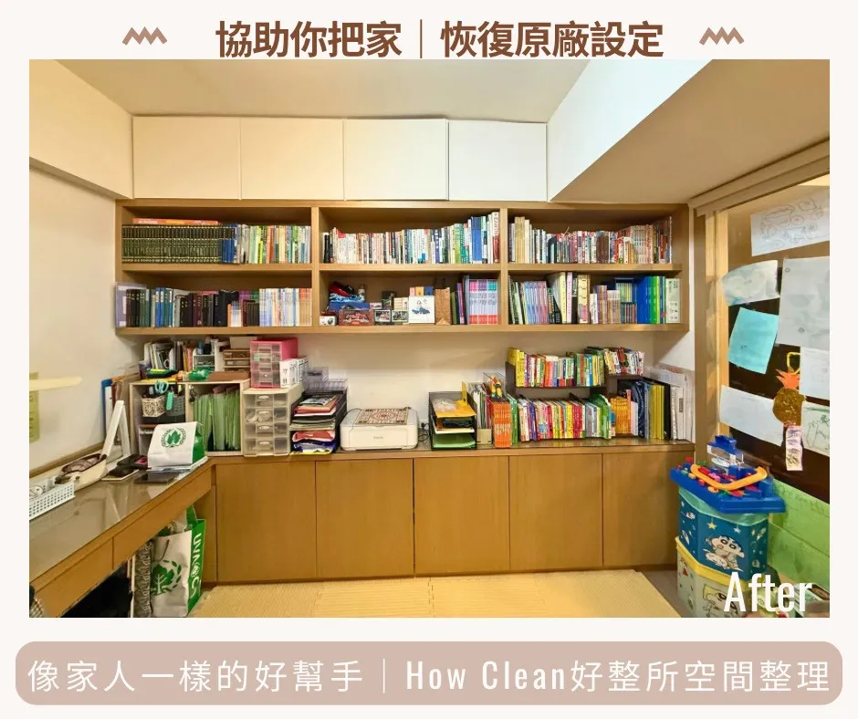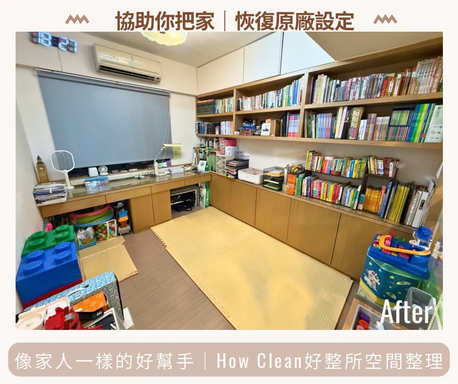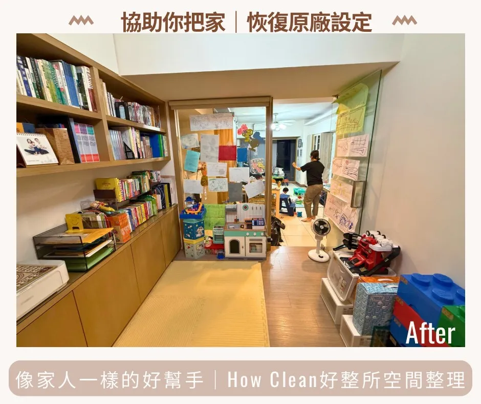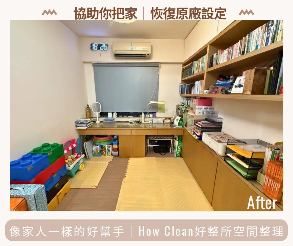 把每一樣玩具、每一本書、每件小物分類、歸位、重新定義位置。也陪媽媽一起做選擇——什麼要留下、什麼其實已經不需要。也一起整理了她一直覺得不實用的書櫃,那瞬間,她的笑容比空間還清爽。整理完的書房變得明亮、好用、乾淨,也真正回到「書房」該有的樣子。而孩子的遊戲區,也終於有了自己的小天地。
