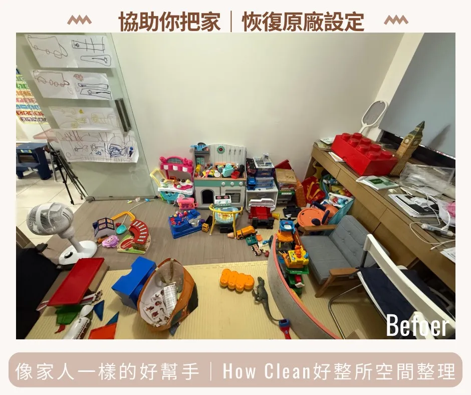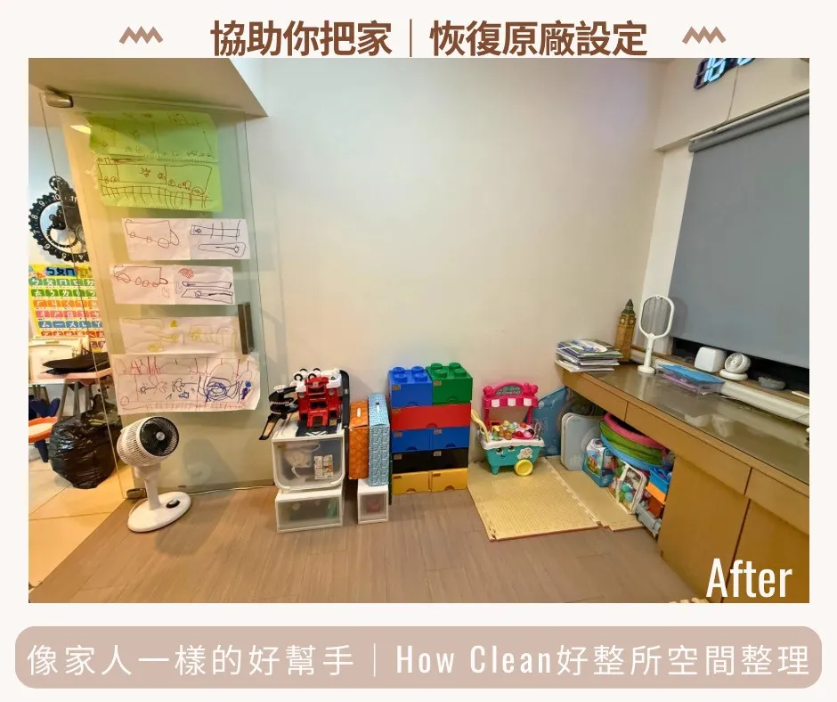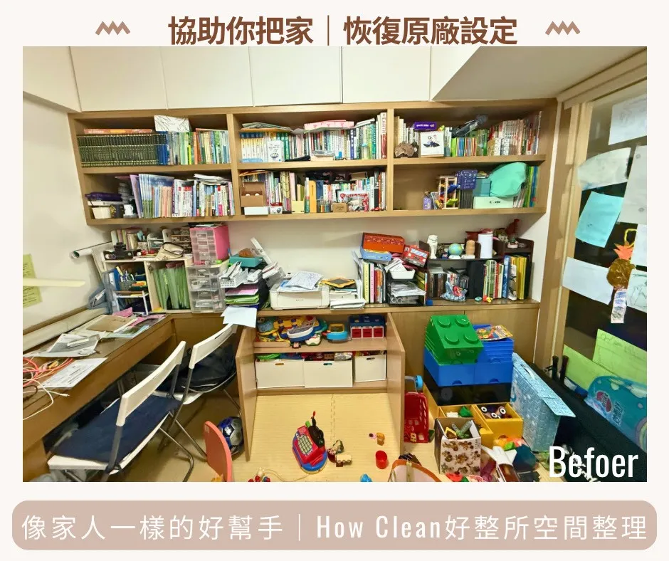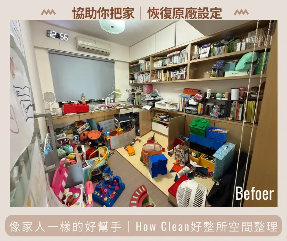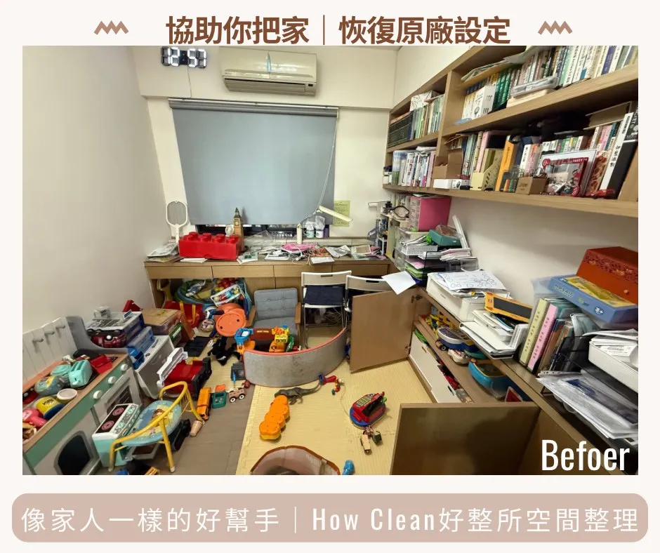 把每一樣玩具、每一本書、每件小物分類、歸位、重新定義位置。也陪媽媽一起做選擇——什麼要留下、什麼其實已經不需要。也一起整理了她一直覺得不實用的書櫃,那瞬間,她的笑容比空間還清爽。整理完的書房變得明亮、好用、乾淨,也真正回到「書房」該有的樣子。而孩子的遊戲區,也終於有了自己的小天地。