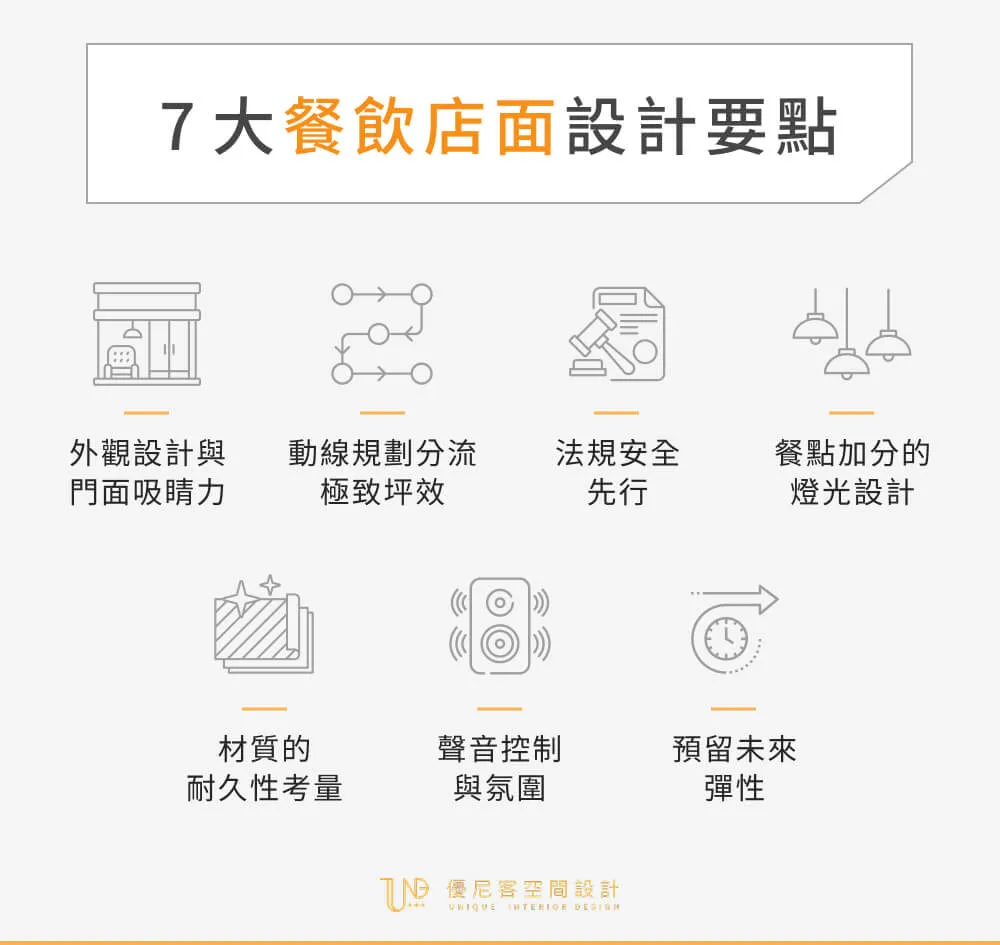 好的餐廳店面設計可以提升顧客忠誠度,乾淨舒適的用餐環境是讓顧客決定是否再次光顧的重要因素,以下為你介紹餐飲店面設計的 7 大黃金要點,從外觀設計、動線規劃、法規安全、燈光設計、材質選用、聲音控制與氛圍,到預留未來彈性,幫助你打造兼具「功能」與「感官體驗」的完美店面空間。