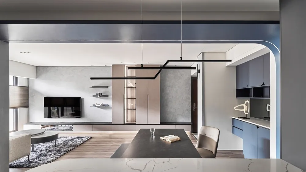 全室以灰藍與大地色系為基調,營造開闊清爽感,並以隱藏門片、展示櫃與鐵件層板等元素簡化視覺。空間運用壁燈、層板燈、軌道燈等多層次光源,為不同場域打造對應氛圍。天花板採俐落勾縫收邊,取代複雜造型,凸顯細節質感。整體設計平衡了冷暖材質,並透過線條與光影的搭配,完美詮釋現代風格的機能與質感。