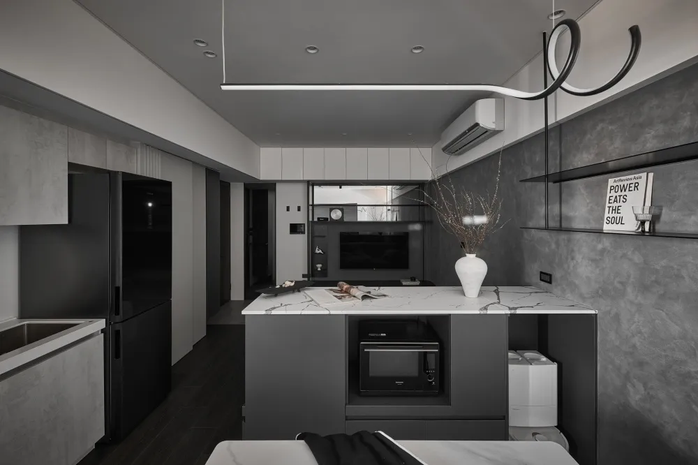 幾何形狀的融入:透過長方形、正方形等單純的幾何形體,應用於門片、層架或造型中島,清楚區分不同的功能區域。
