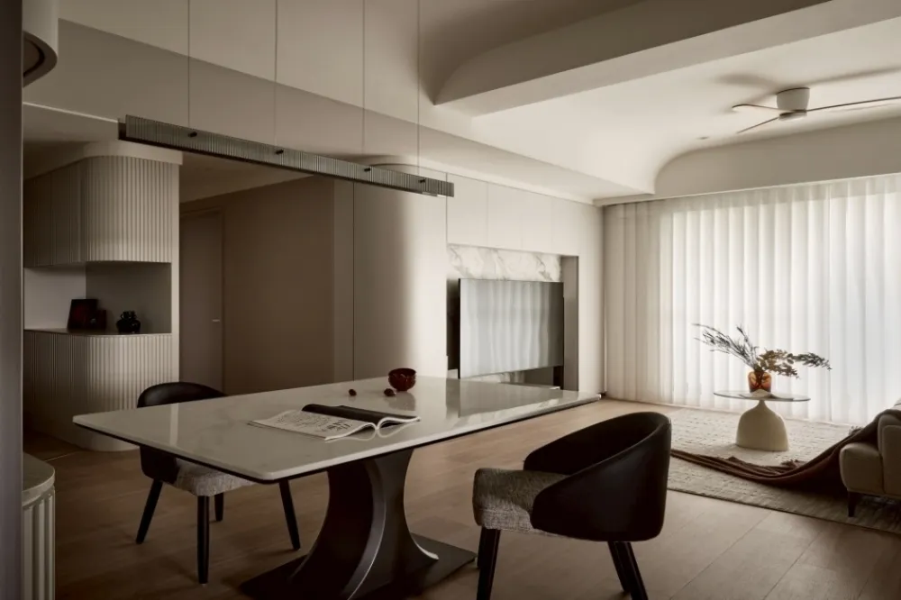 質感對比:以大理石、鍍鈦金屬、烤漆玻璃等冷硬材質,搭配木質、皮革、織品、特殊漆等溫潤素材。