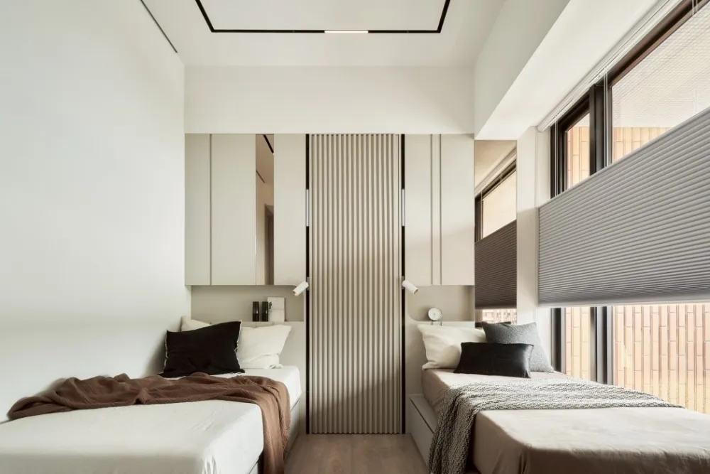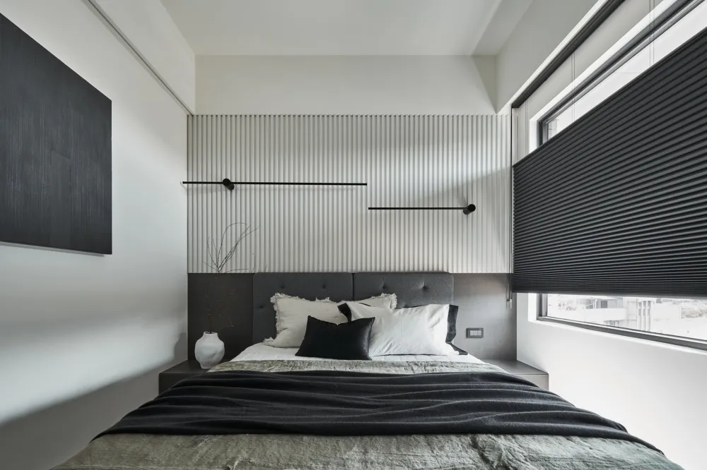 臥室延續同樣的現代調性,以線性格柵床頭與淺色石紋衣櫃打造乾淨層次。衛浴入口加上格柵造型拉門,讓立面更平整,也自然形成好握的門把細節。窗邊採用造型簡約的蜂巢簾,兼具調節光線與隔熱效果。透過格柵門、蜂巢簾等元素,整體空間在簡約中展現層次,體現現代風格兼顧機能與美學的設計精神。