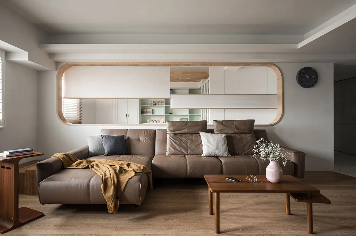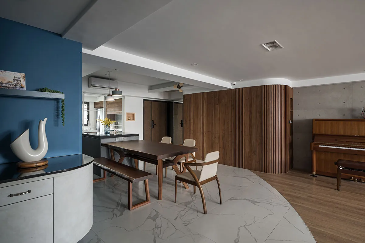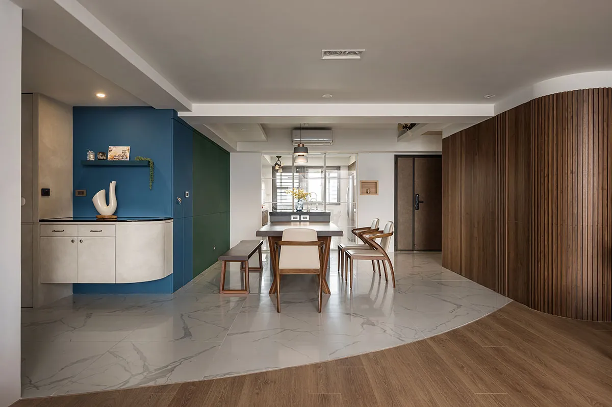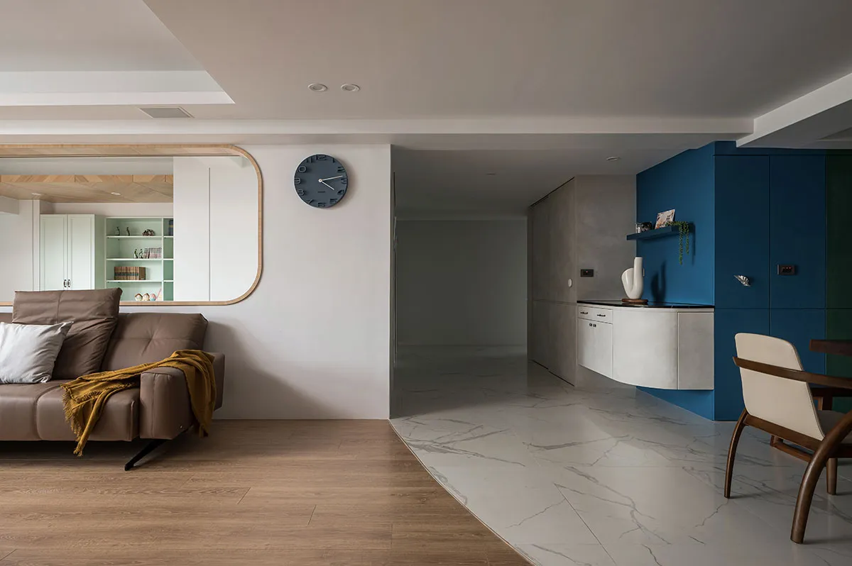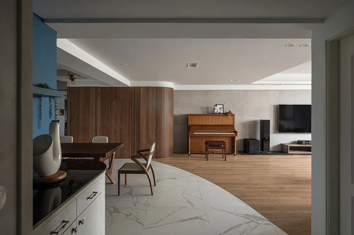 這是一對眼科醫生夫婦的住家,位在住商合一的辦公大樓,樓層高度略低,所以屋主一開始會擔心改裝後的住家空間會不會顯得低矮。利合室內設計 在規劃空間時,考量到屋主需求,於是空間裡埋入圓弧造型,空間採開放設計,隱沒直角的銳利並讓開放規劃帶來空間鬆弛感,避掉樓層低矮問題,同時像投射了屋主夫婦的眼科職業,開眼般打開生活新視角。