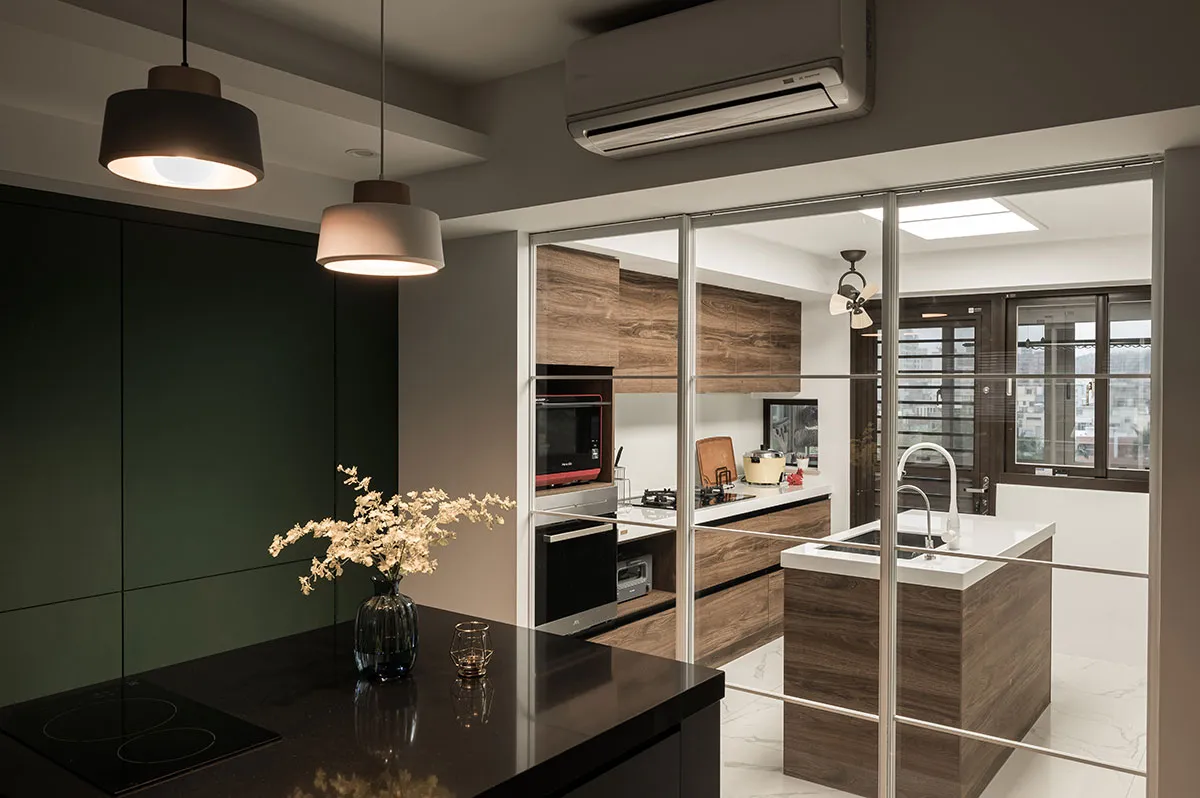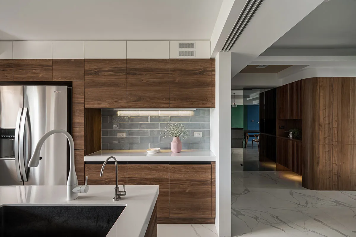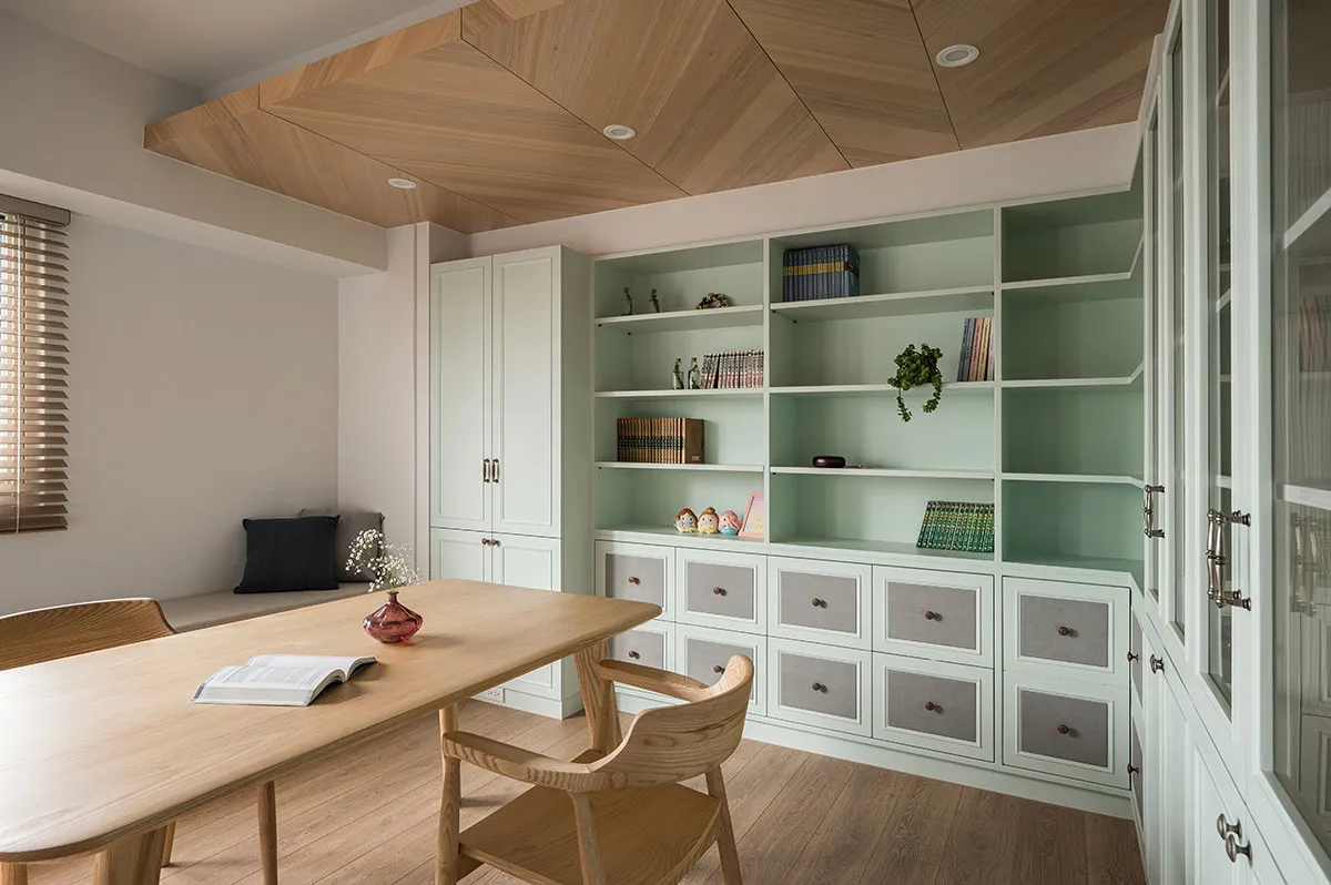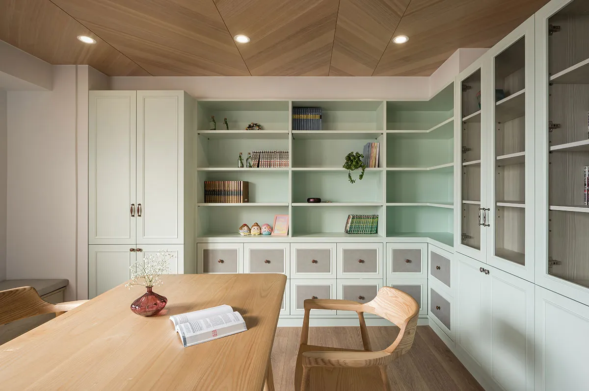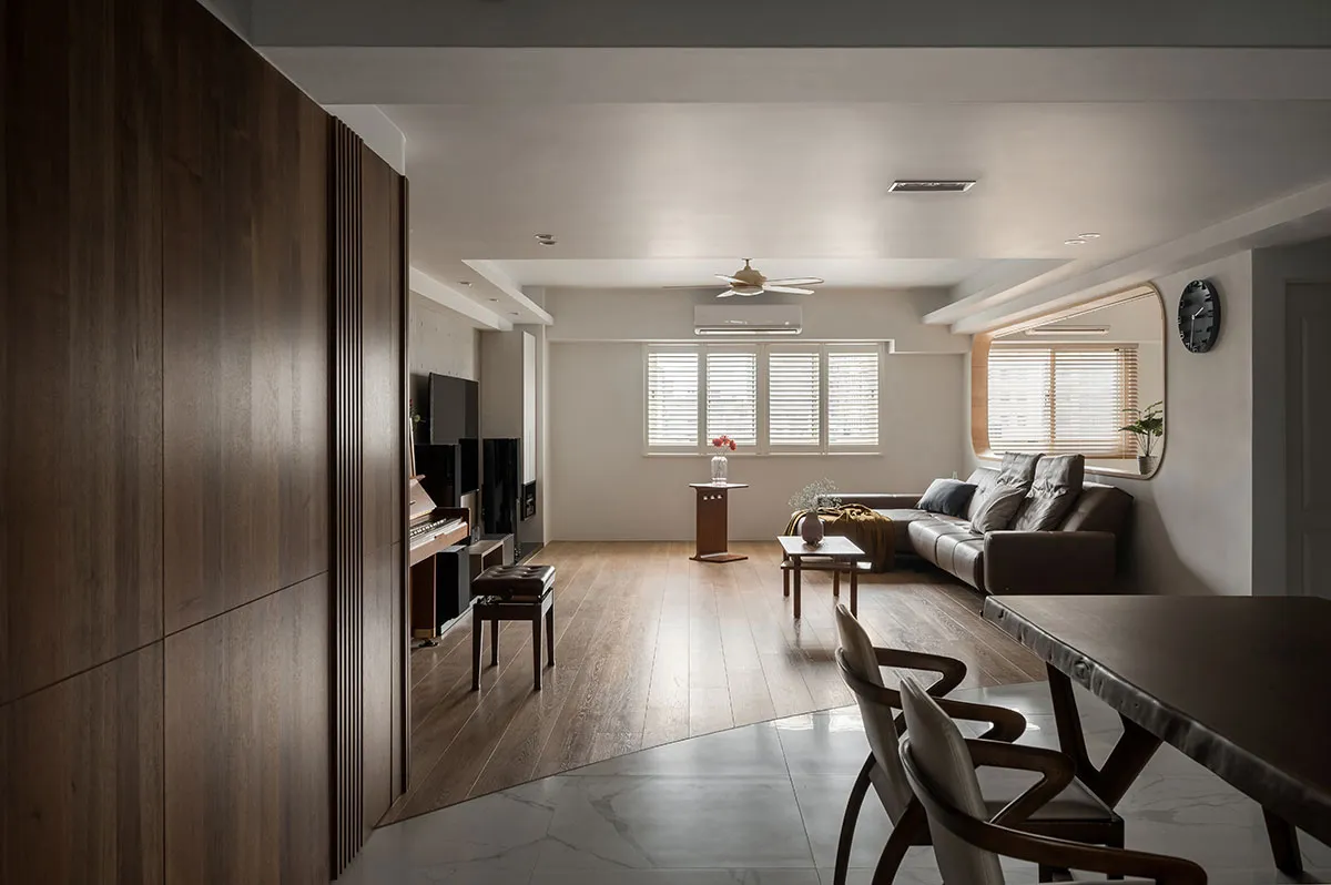 這是一對眼科醫生夫婦的住家,位在住商合一的辦公大樓,樓層高度略低,所以屋主一開始會擔心改裝後的住家空間會不會顯得低矮。利合室內設計 在規劃空間時,考量到屋主需求,於是空間裡埋入圓弧造型,空間採開放設計,隱沒直角的銳利並讓開放規劃帶來空間鬆弛感,避掉樓層低矮問題,同時像投射了屋主夫婦的眼科職業,開眼般打開生活新視角。