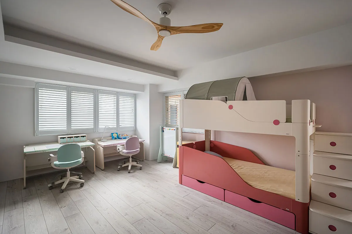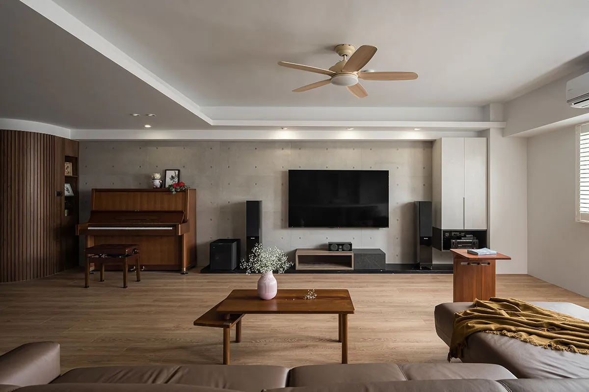 風格上因為女屋主喜歡法式鄉村,男屋主傾向日式簡約帶工業風,為了融合兩者喜好,於是以設計師的專業來做美學規劃,和屋主充分溝通後,公共空間以男主人日式簡約為主,木質地板、玄關木格柵立面,搭配清水模電視牆和白色銀狐大理石,鋪陳空間輕鬆自在;和書房銜接的圓弧狀拱門以原木質調做中介,書房切換成女主人的優雅法式鄉村風,讓公領域空間巧妙融合不同視覺效果。