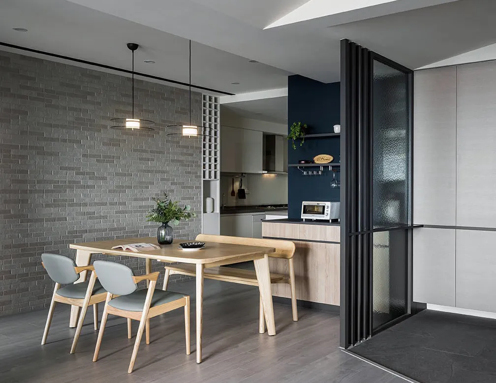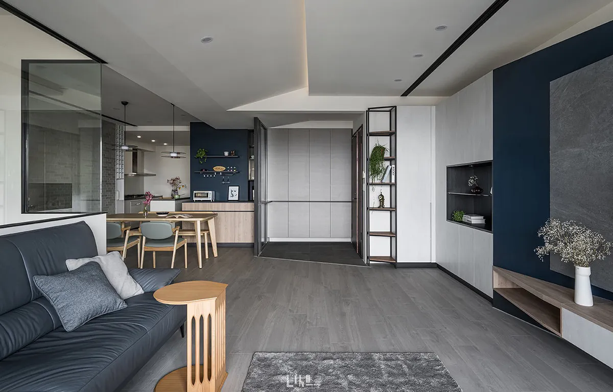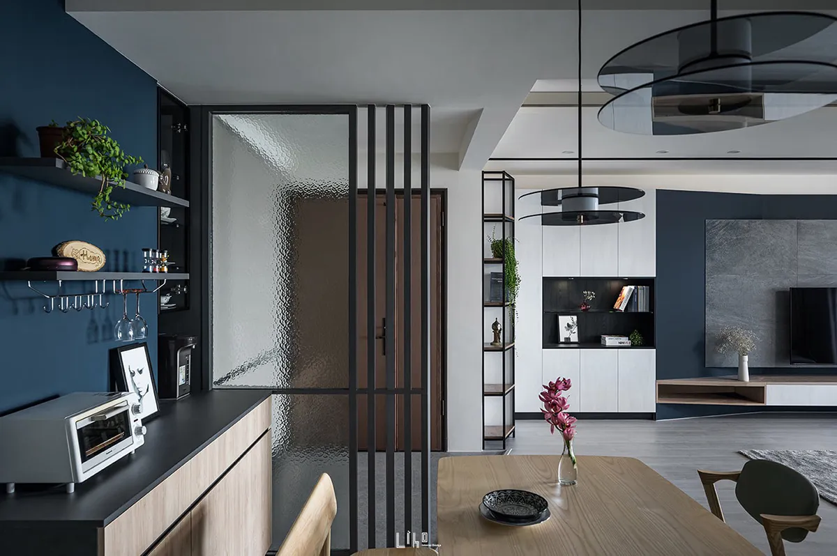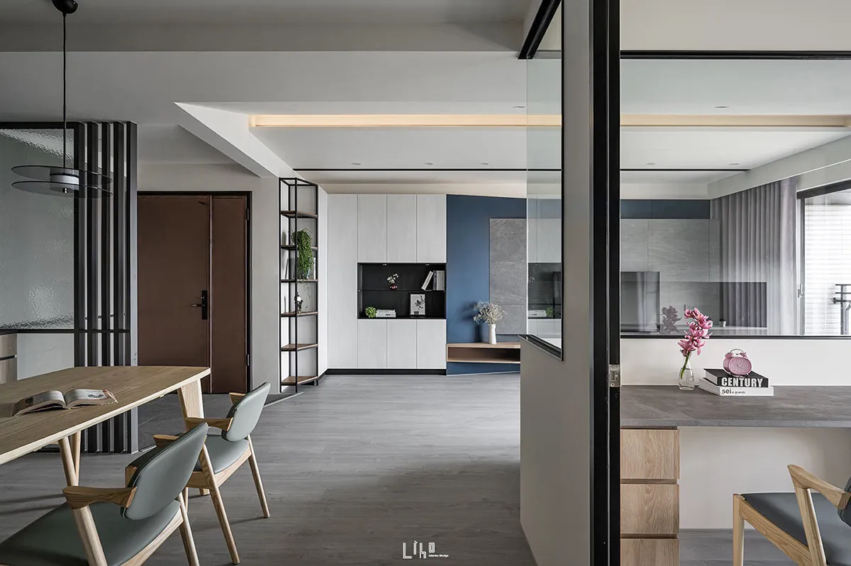一道道斜線漫佈於四周角落,毫無聲息地撐開三維軸向,蔓延了視線範圍、暈開了柔和暖光,宛若再度拾回那份開闊無拘限,在屬於先生負責的公領域,以沉斂堅毅定出主格調,佐以靛青藍與溫厚素材烘托寧謐情境。