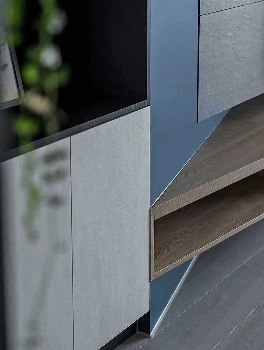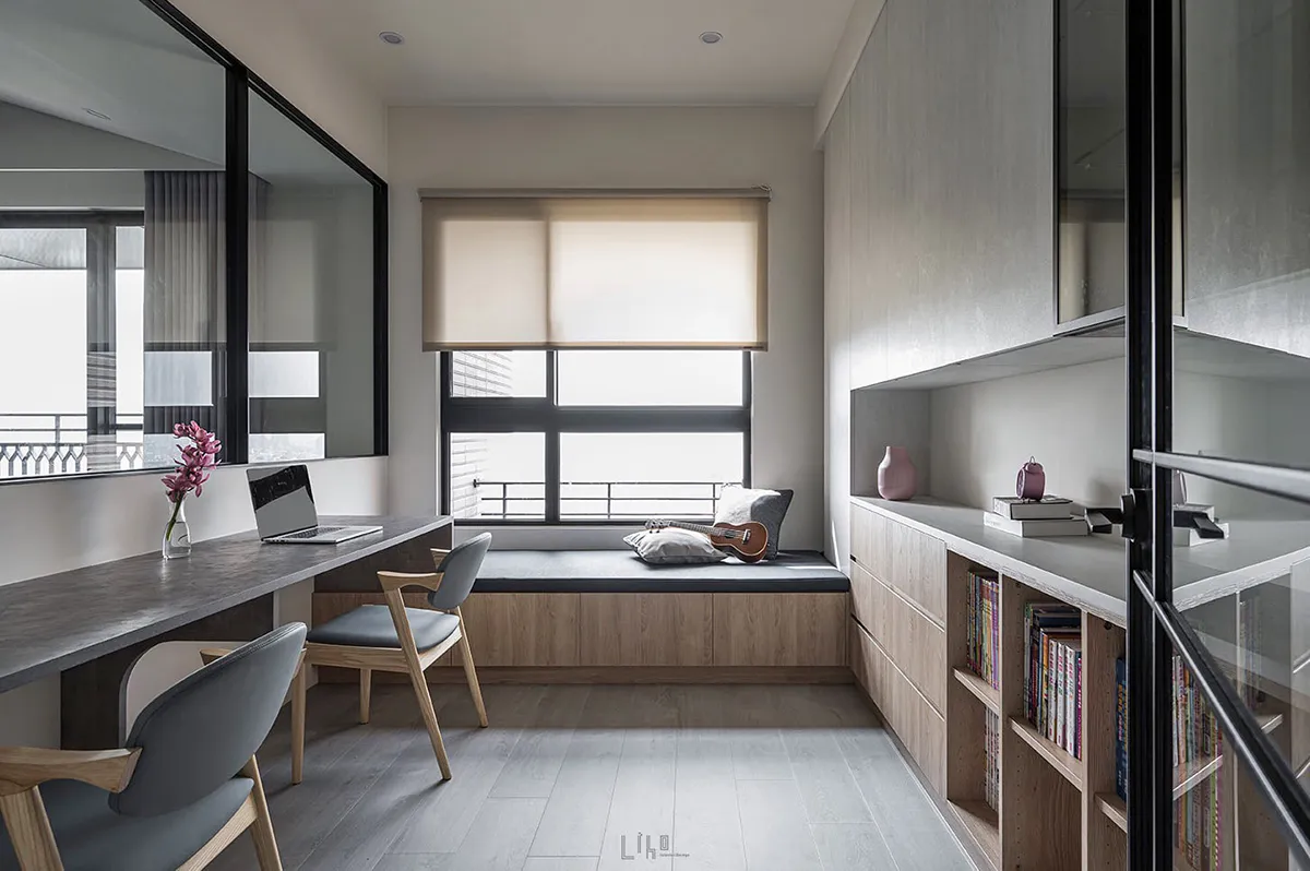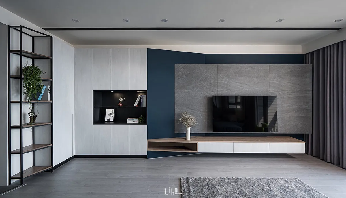 一道道斜線漫佈於四周角落,毫無聲息地撐開三維軸向,蔓延了視線範圍、暈開了柔和暖光,宛若再度拾回那份開闊無拘限,在屬於先生負責的公領域,以沉斂堅毅定出主格調,佐以靛青藍與溫厚素材烘托寧謐情境。