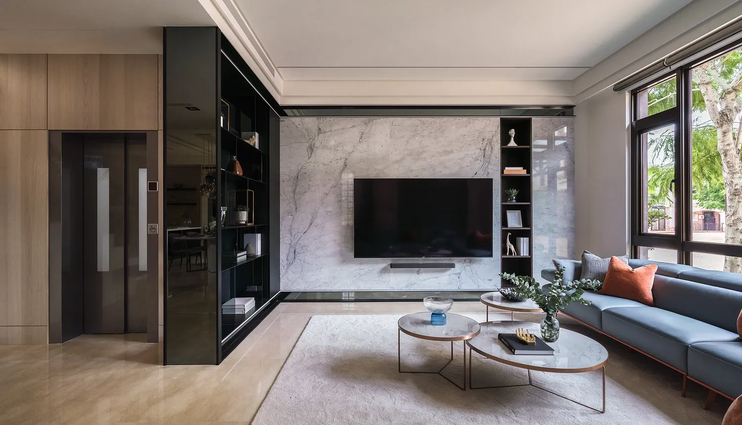 地坪以淺色拋光石英磚鋪陳,提升整體明亮度並平衡深色量體。