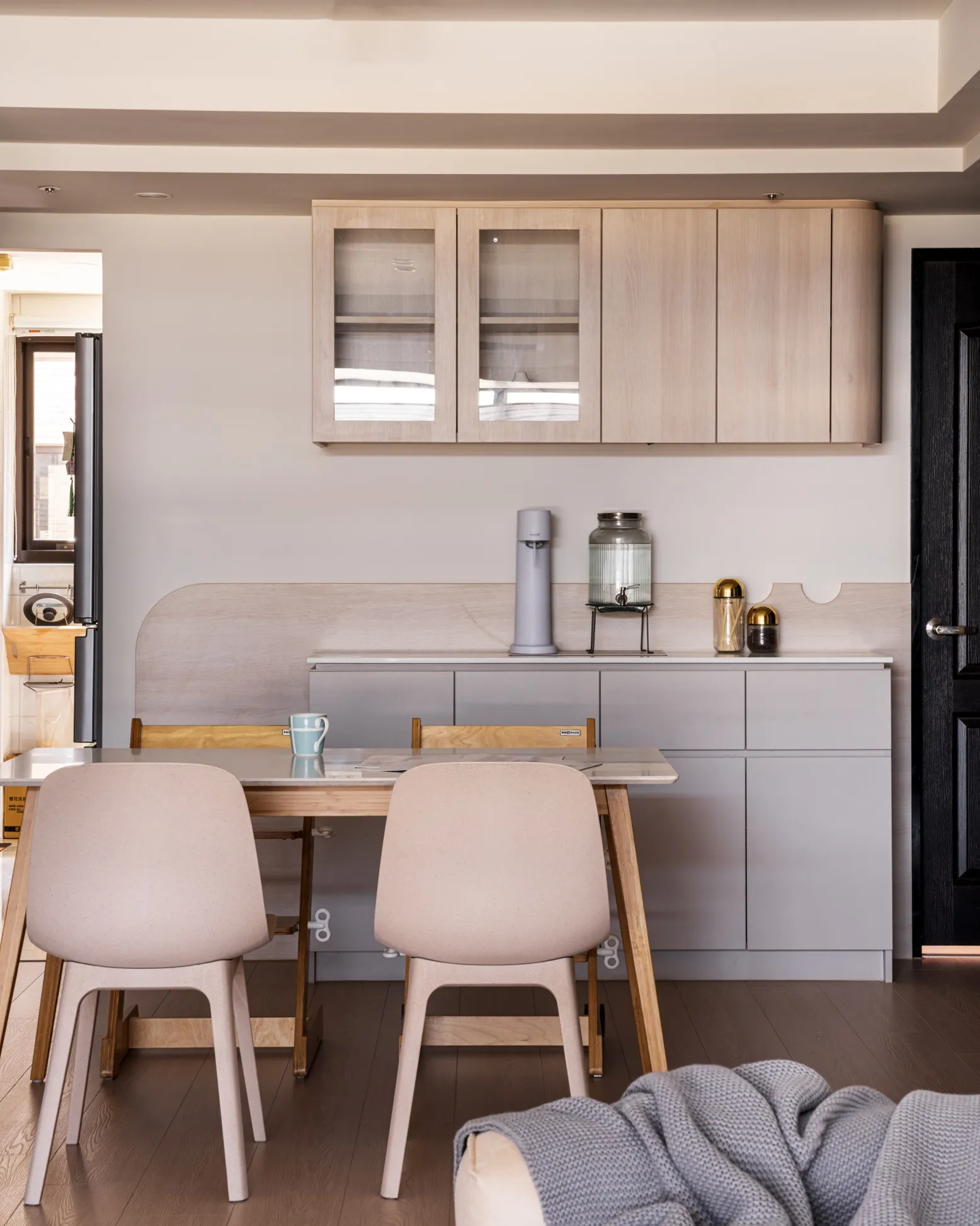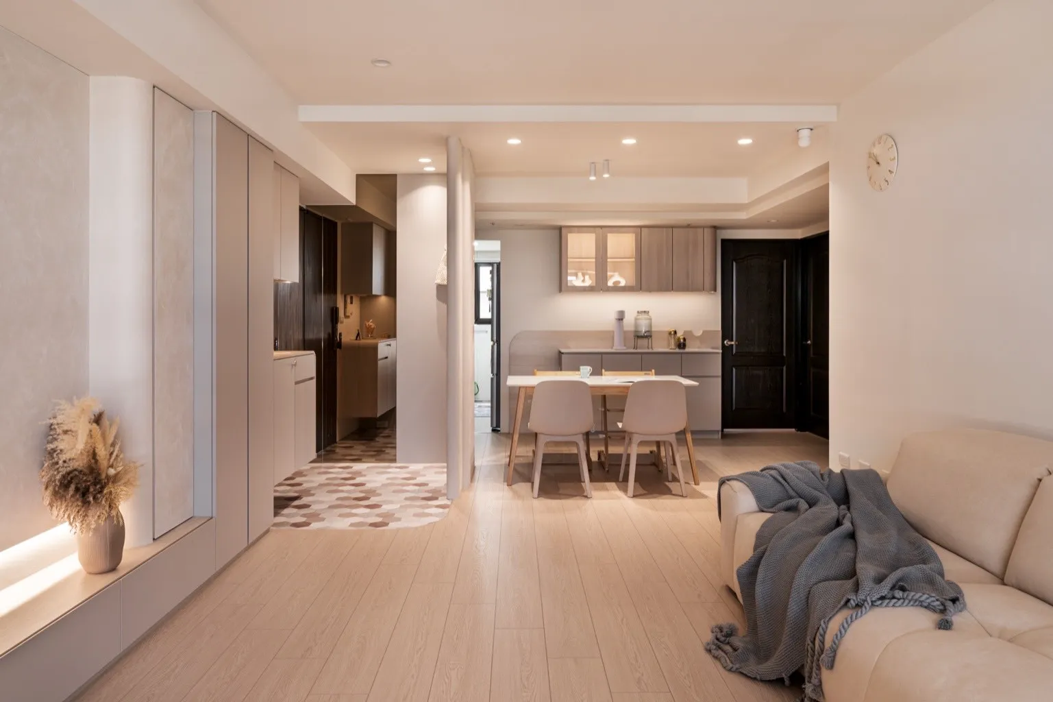 • 工程範圍|玄關量體新增、餐廳區配置調整、局部木作與燈光配置