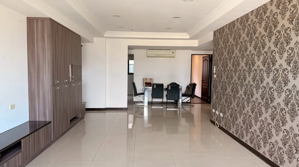 電視牆、收納櫃、餐桌、動線,