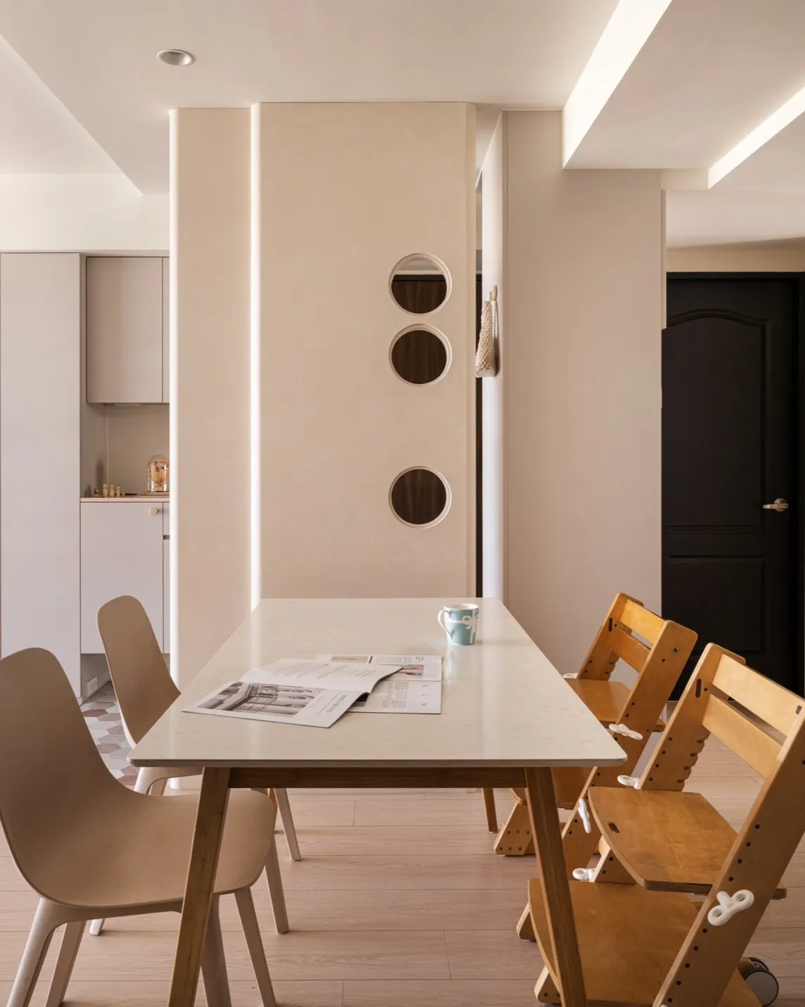 • 材質選用|木作、圓孔造型牆、霧面塗料、柔性光源