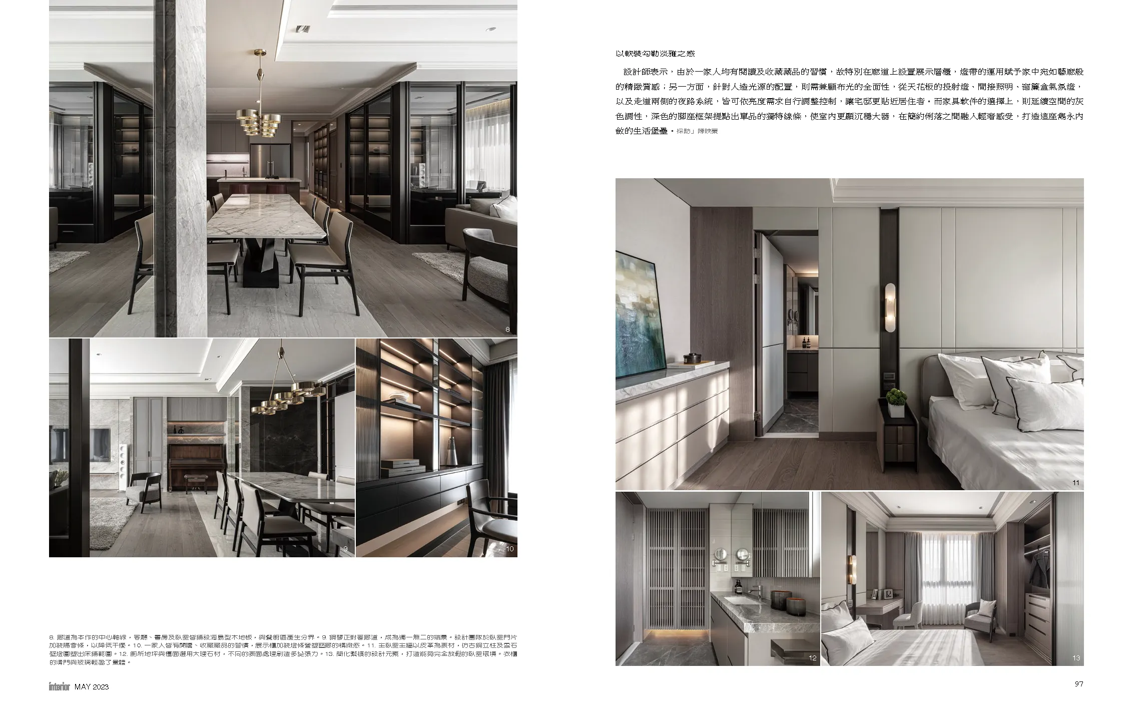 設計師表示,由於一家人均有閱讀及收藏藏品的習慣,故特別在廊道上設置展示層櫃,燈帶的運用賦予家中宛如藝廊般的精緻質感;另一方面,針對人造光源的配置,則需兼顧布光的全面性,從天花板的投射燈、間接照明、窗簾盒氣氛燈,以及走道兩側的夜路系統,皆可依亮度需求自行調整控制,讓宅邸更貼近居住者。而家具軟件的選擇上,則延續空間的灰色調性,深色的腳座框架提點出單品的獨特線條,使室內更顯沉穩大器,在簡約俐落之間融入輕奢感受,打造這座雋永內斂的生活堡壘。