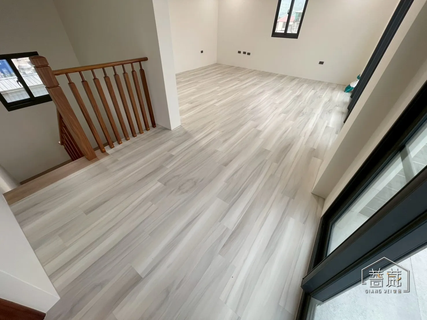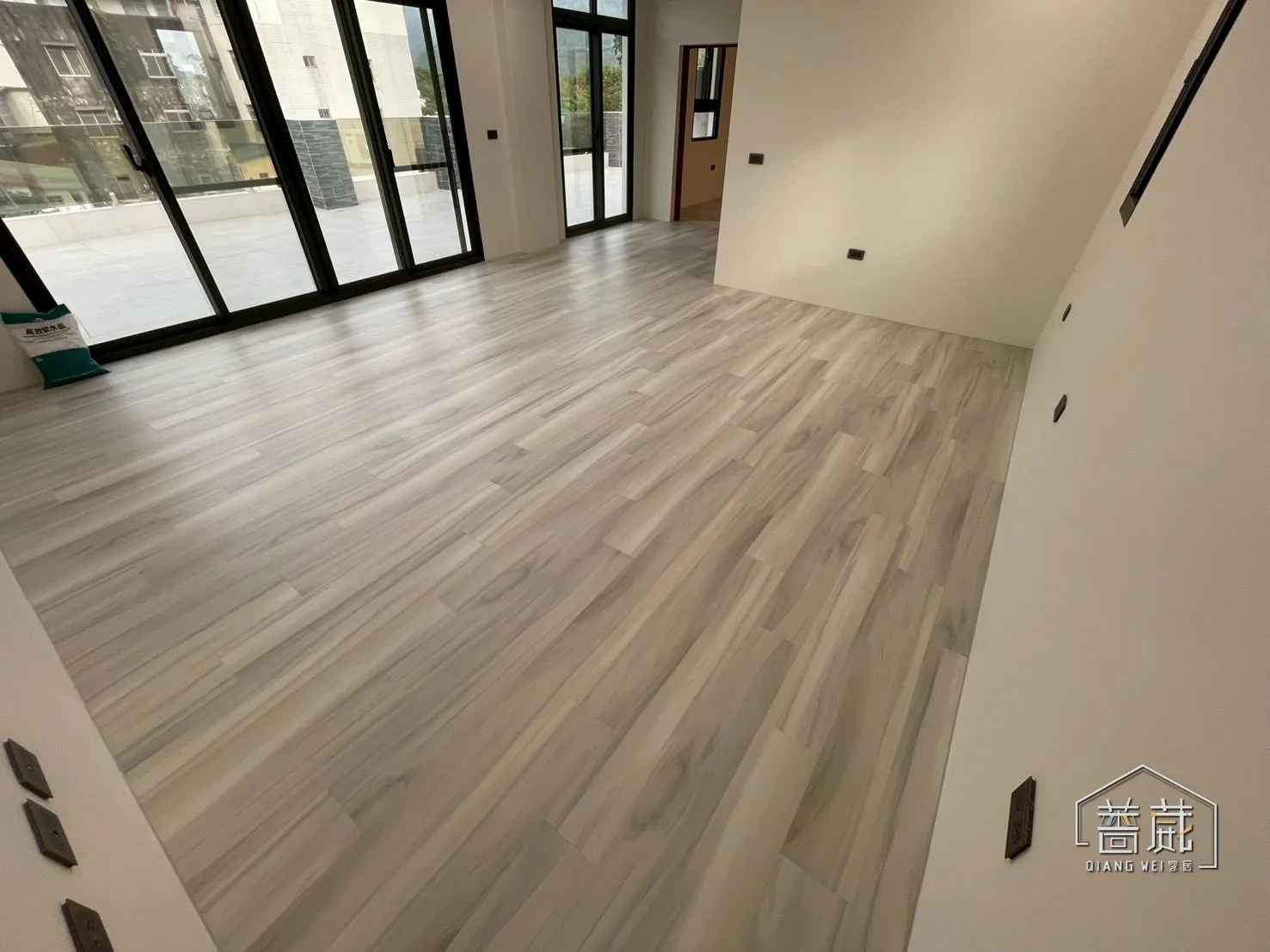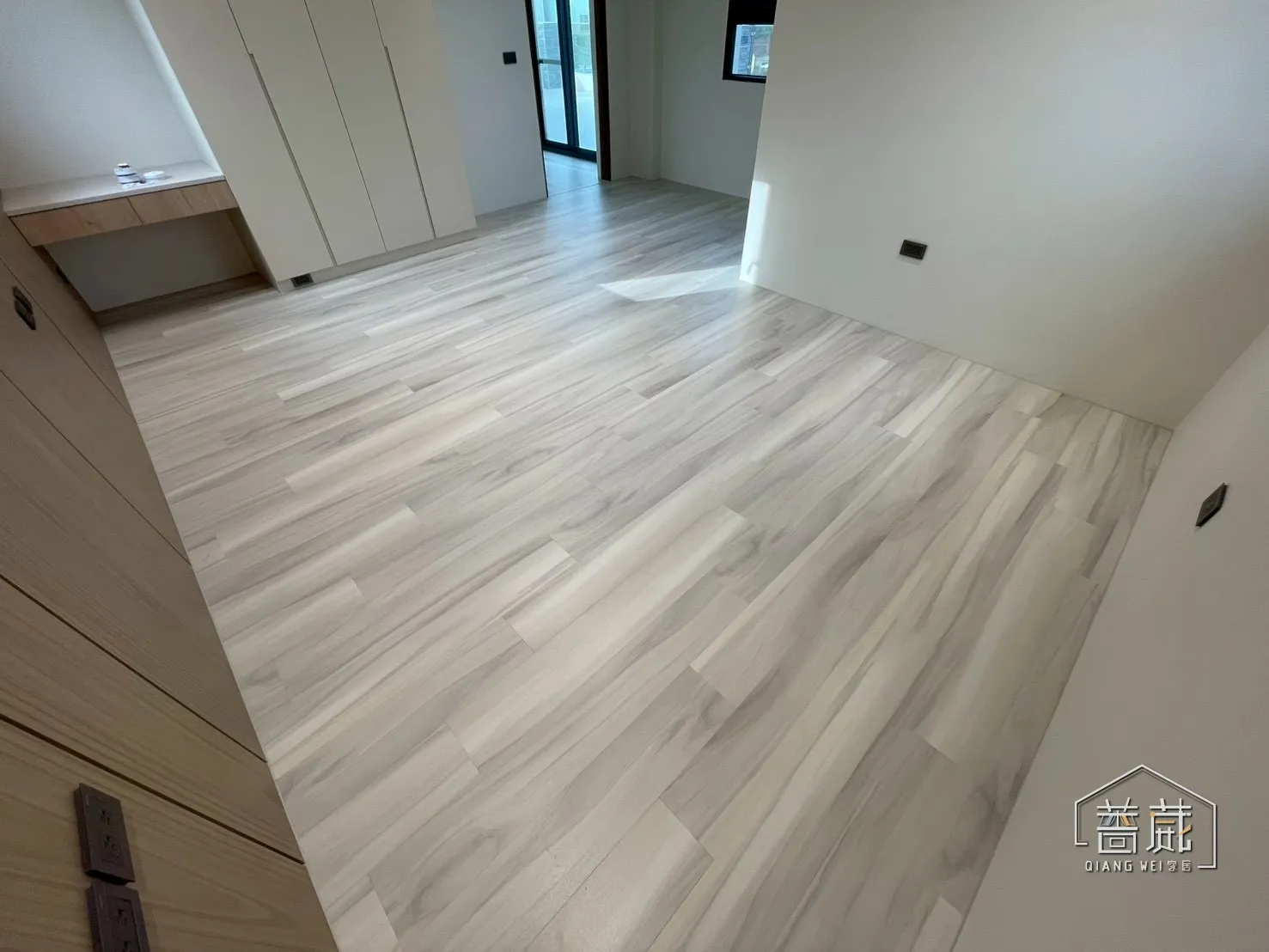 8mm SPC 直舖結構,腳感穩定、不回音,大面積鋪設讓紋理自然延伸,客廳、走道、房間一路一致,空間更顯俐落有序。