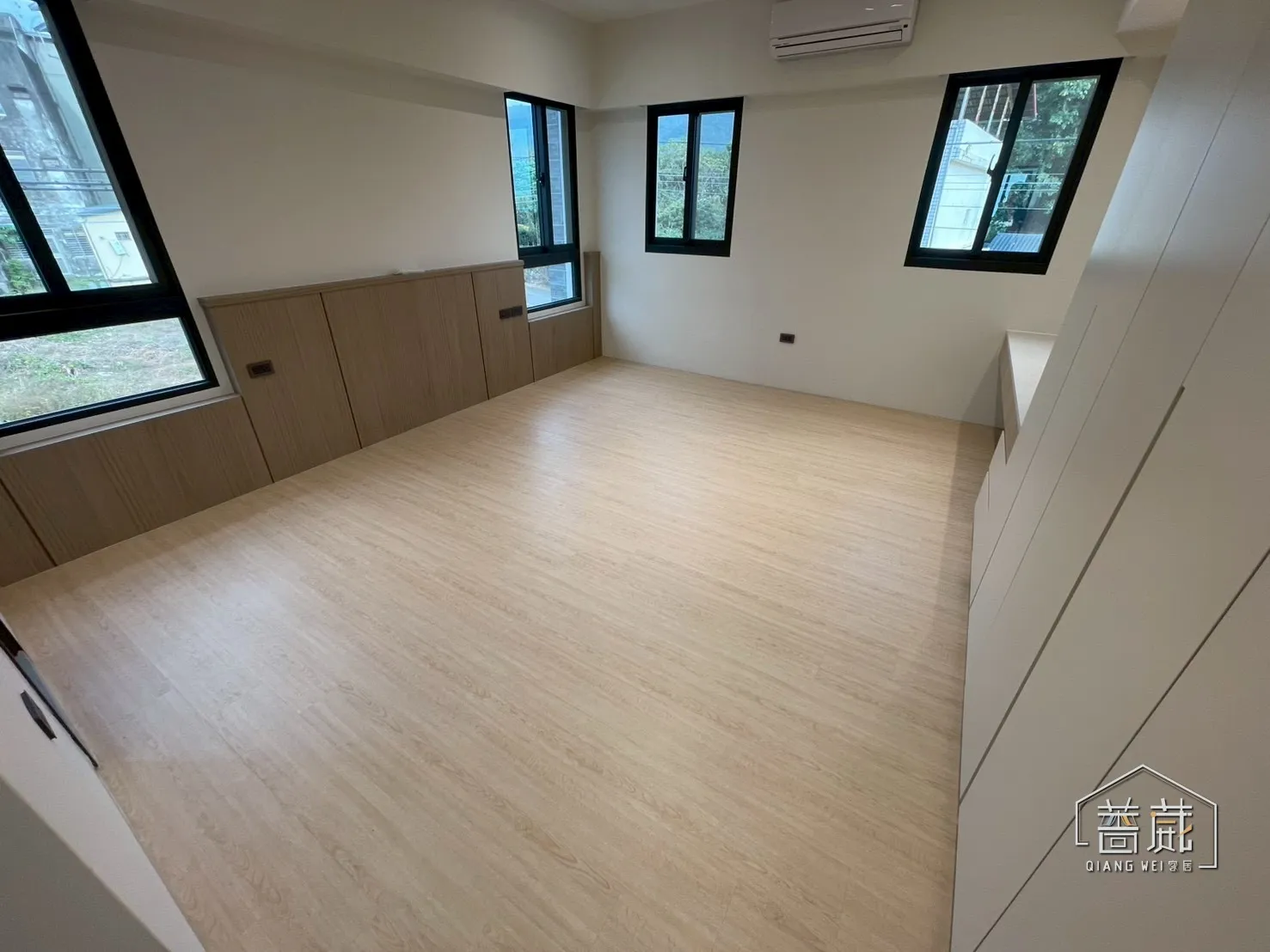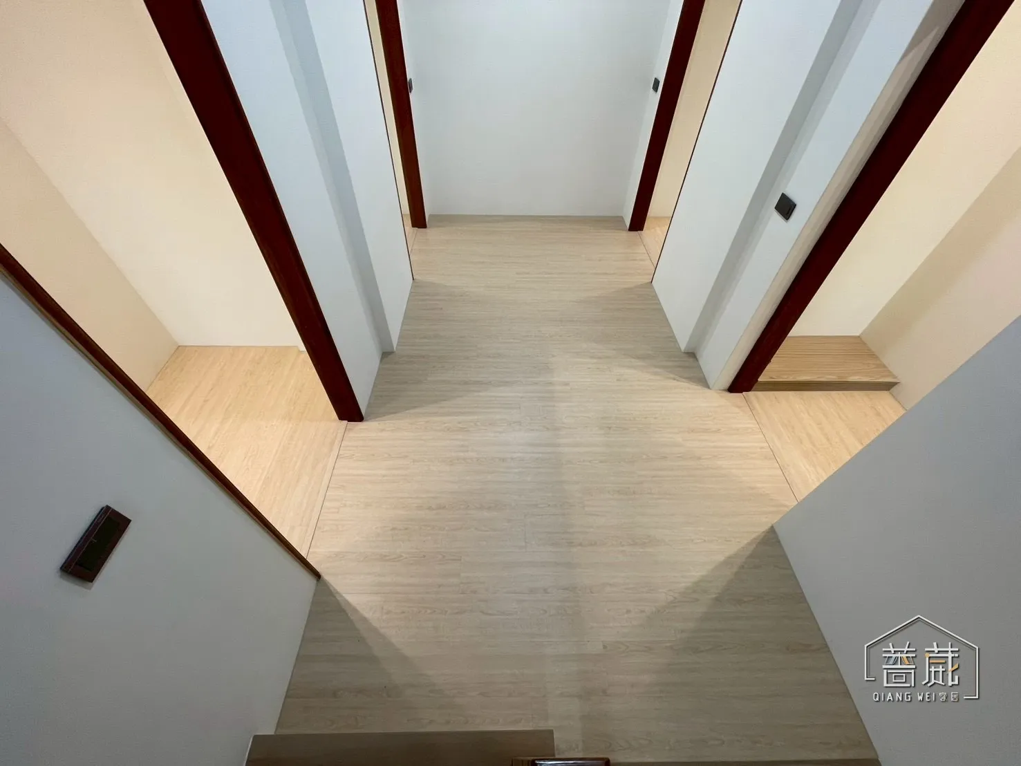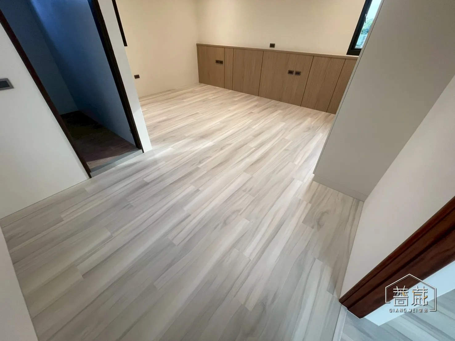 8mm SPC 直舖結構,腳感穩定、不回音,大面積鋪設讓紋理自然延伸,客廳、走道、房間一路一致,空間更顯俐落有序。