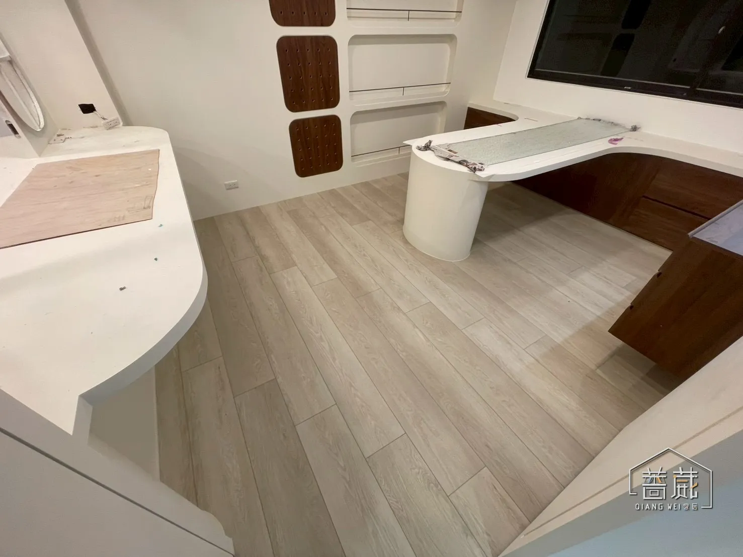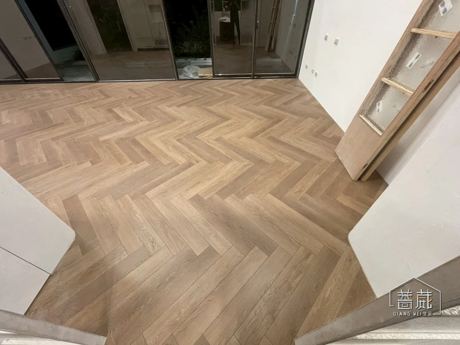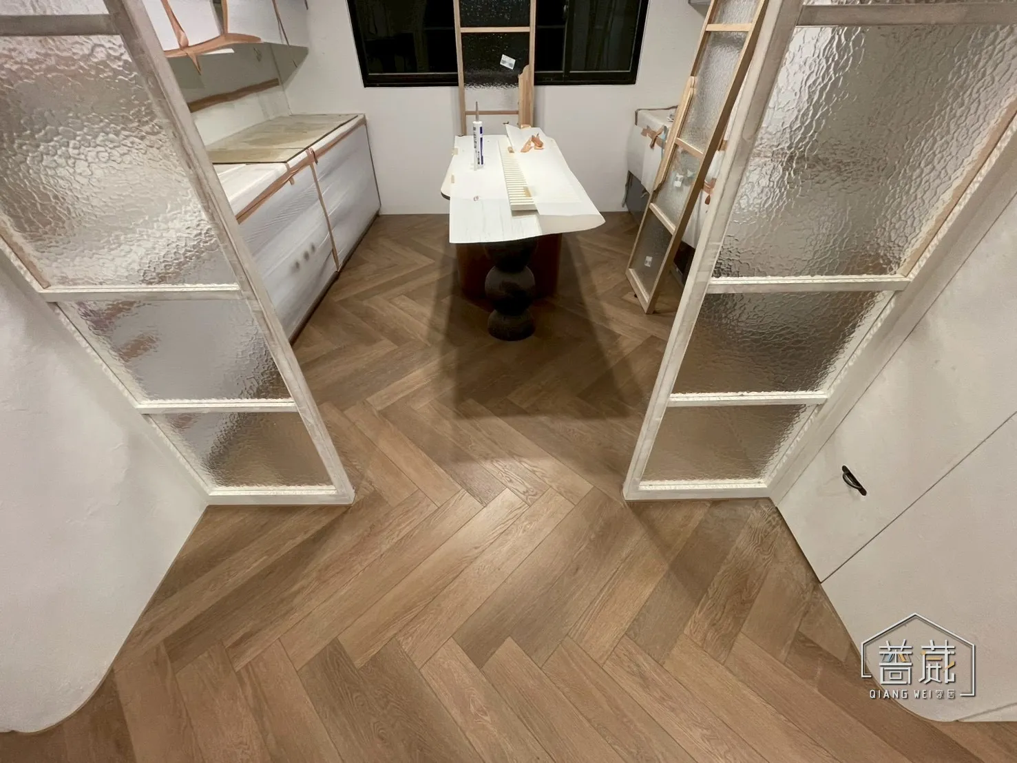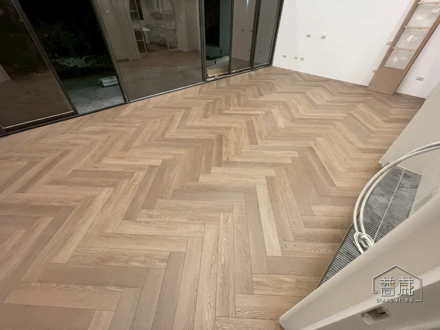 SPC 7.5mm 穩定結構,腳感紮實、不空不響,人字拼施工精準對齊,線條俐落、不凌亂,不只是好看,更是每天實際生活都安心的選擇。