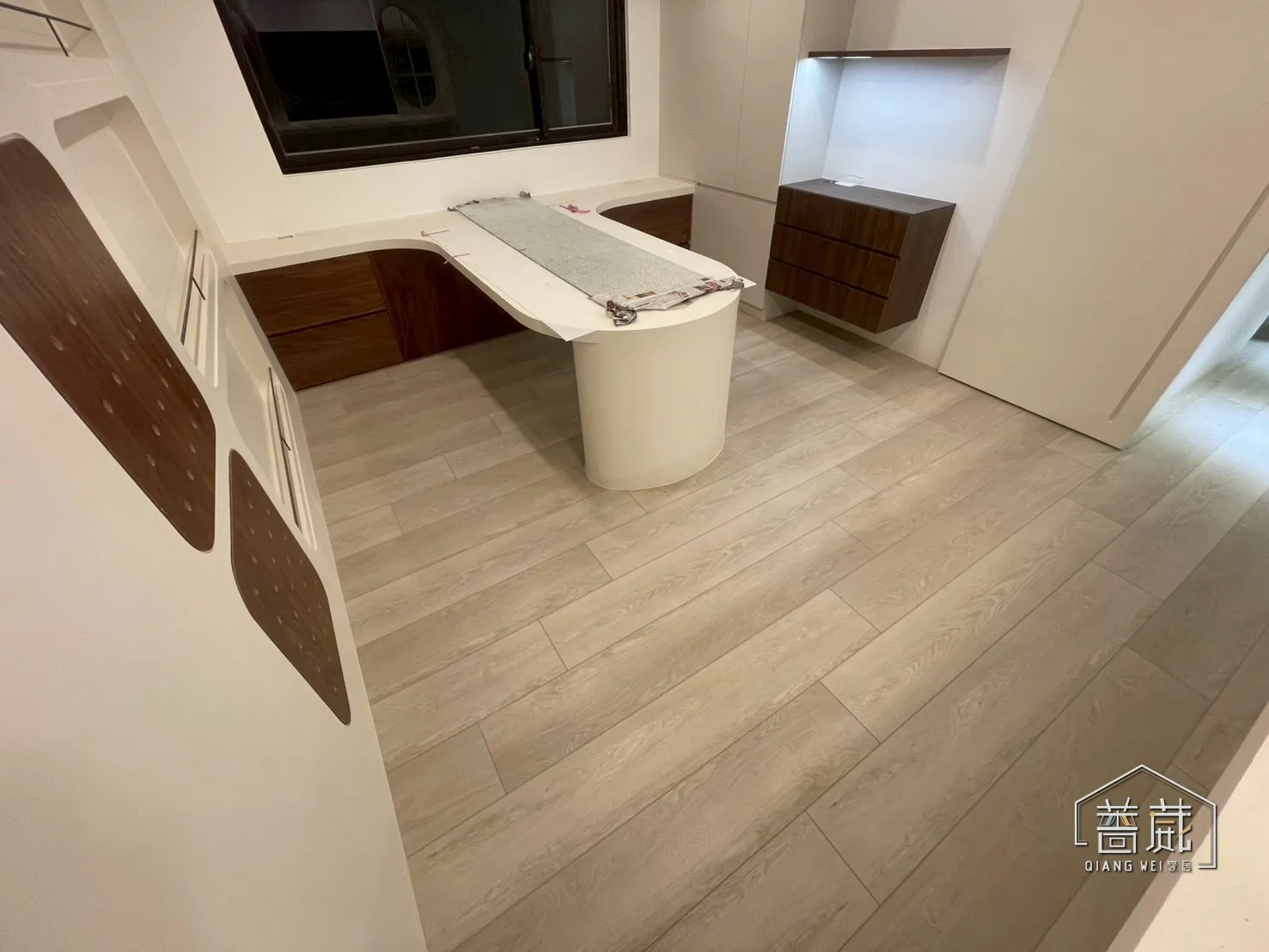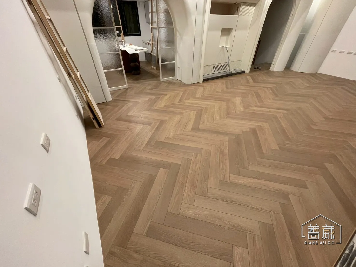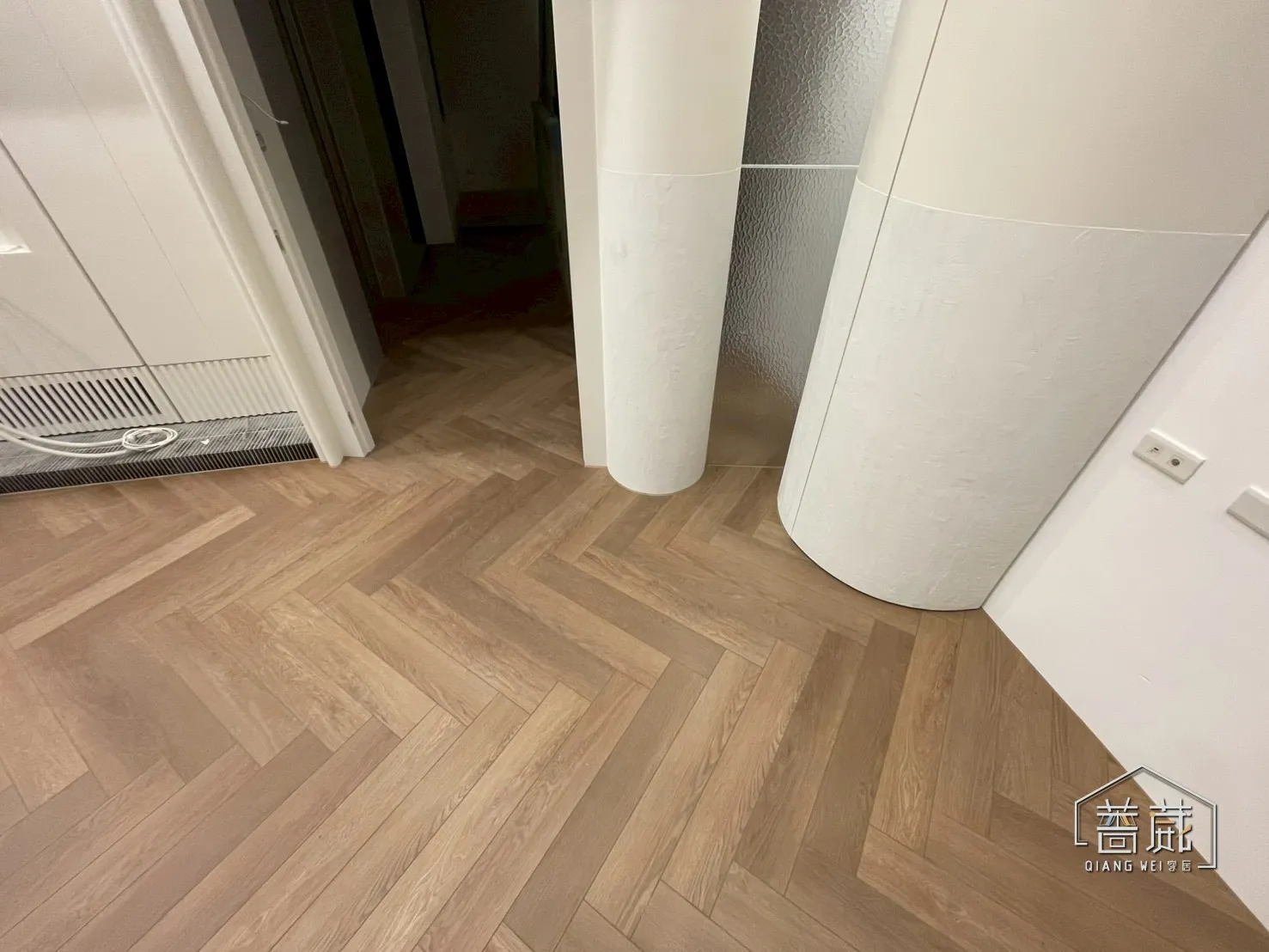 直線鋪陳搭配人字拼轉換區域節奏,客廳開闊、動線自然,圓弧牆面與人字紋理相互呼應,讓設計細節被完整放大,而不是被地板搶走風采。
