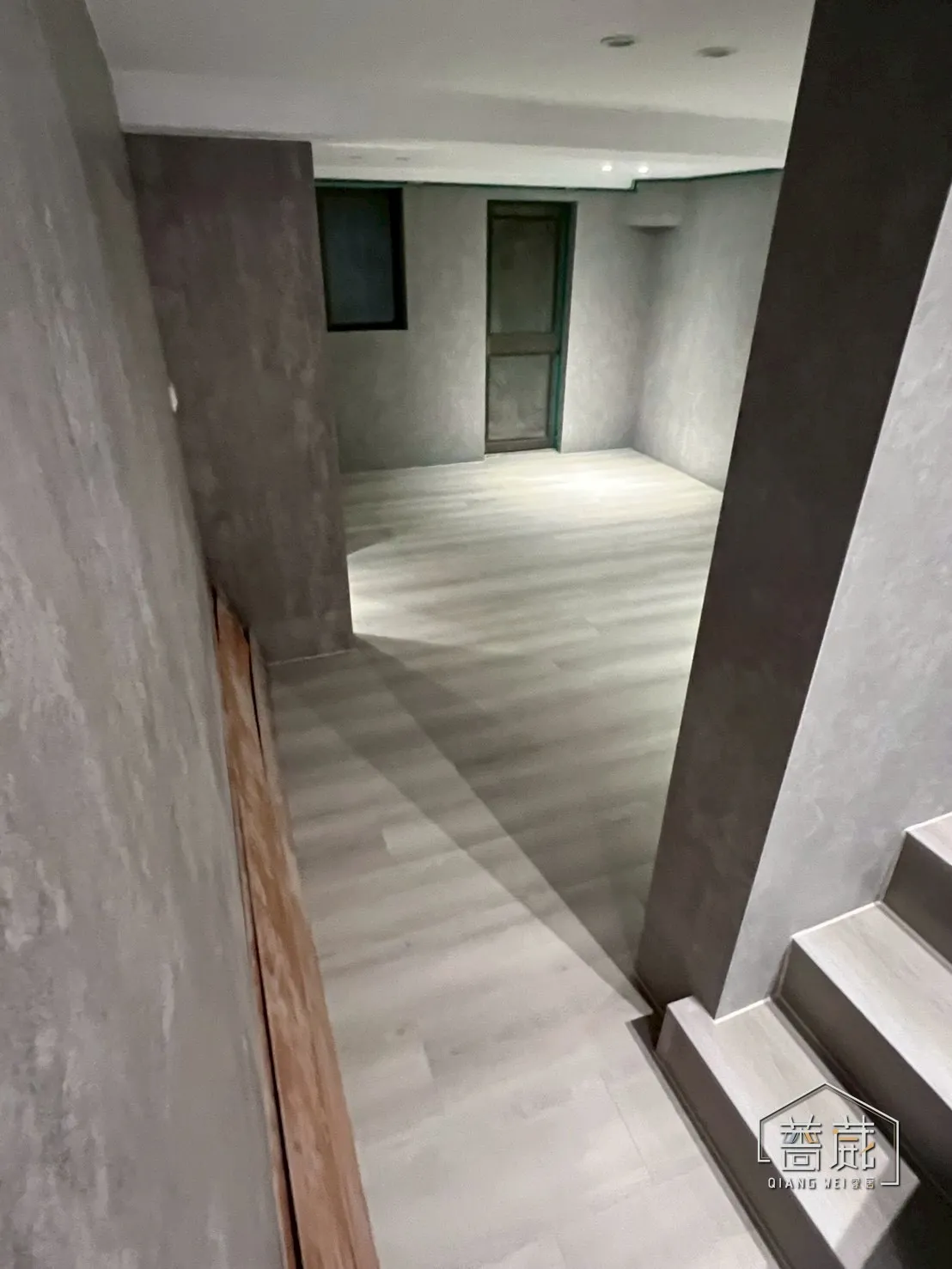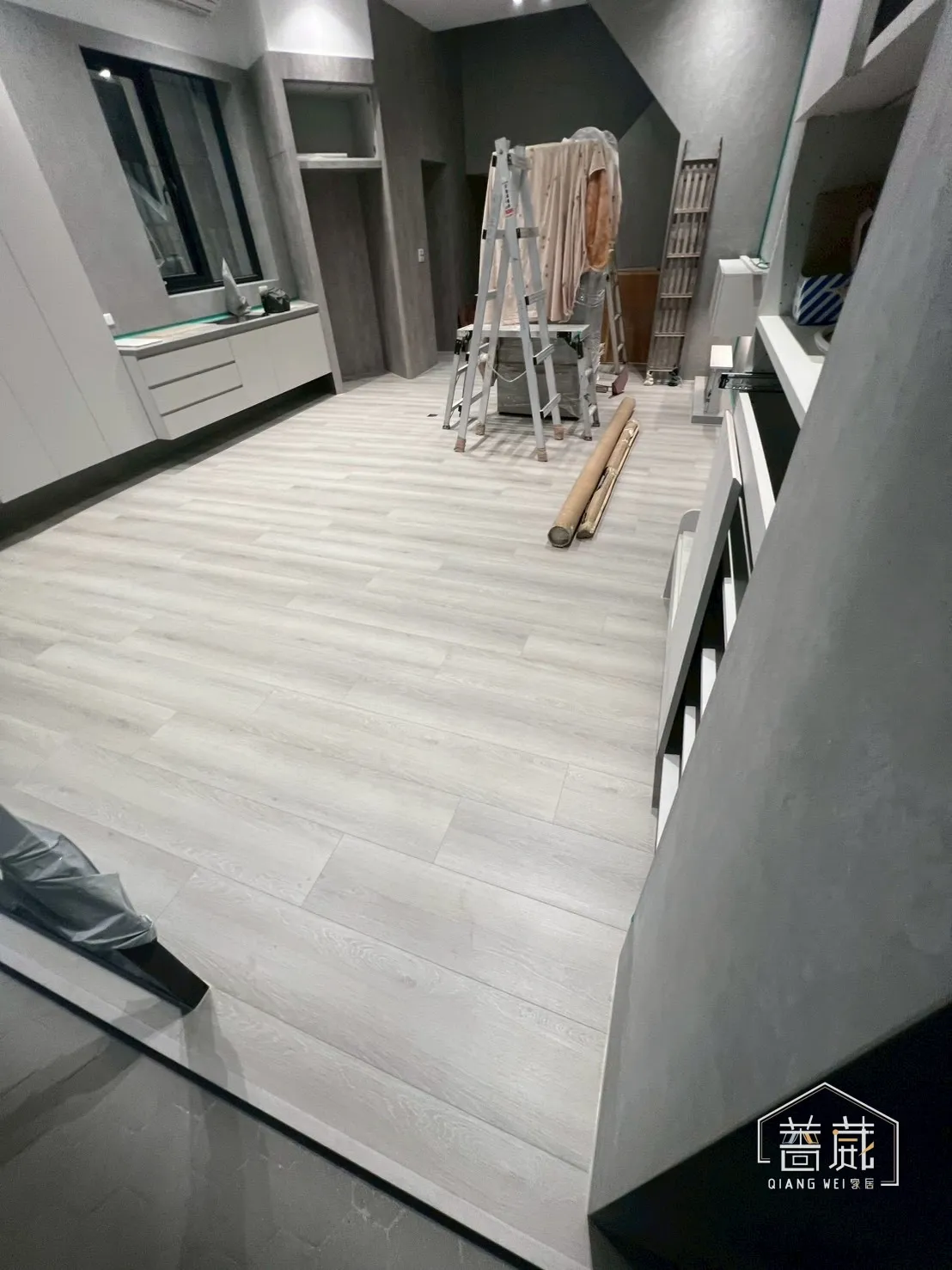 這次整棟採用 SPC 直舖施工,從一樓開放空間一路延伸到樓梯、轉角,視覺連續、動線乾淨,