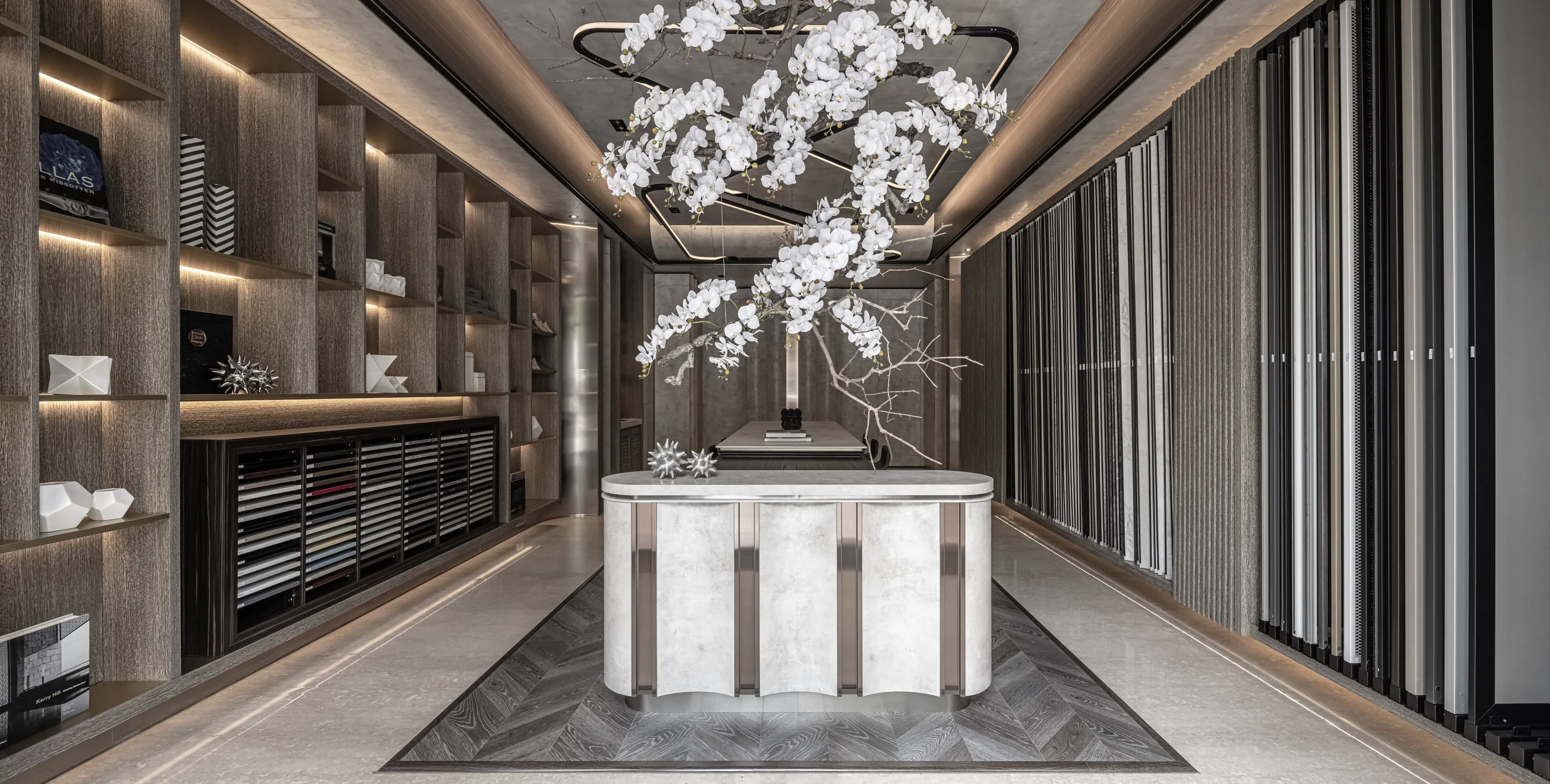 「漣漪」一案,是台灣品牌「伸保木業」位於台中的建材展示中心。騎樓式店面挑高條件相當充足,且交通方便、地點醒目,YHS DESIGN設計事業企圖透過豐富的細節和質感,梳理極致工藝的美學與革新概念,並融入當代時空的情感串聯,打造一處專屬且獨特的選材空間,同時實現對設計及未來生活的憧憬。楊煥生設計師表示,一般系統板材廠商大多是以小樣品或型錄作為媒材與設計方進行接洽,有鑑於此,業主希望打造一間專屬選材室,是一處特別的共享空間,可以實際分享材料真實的尺寸、花紋等細節。