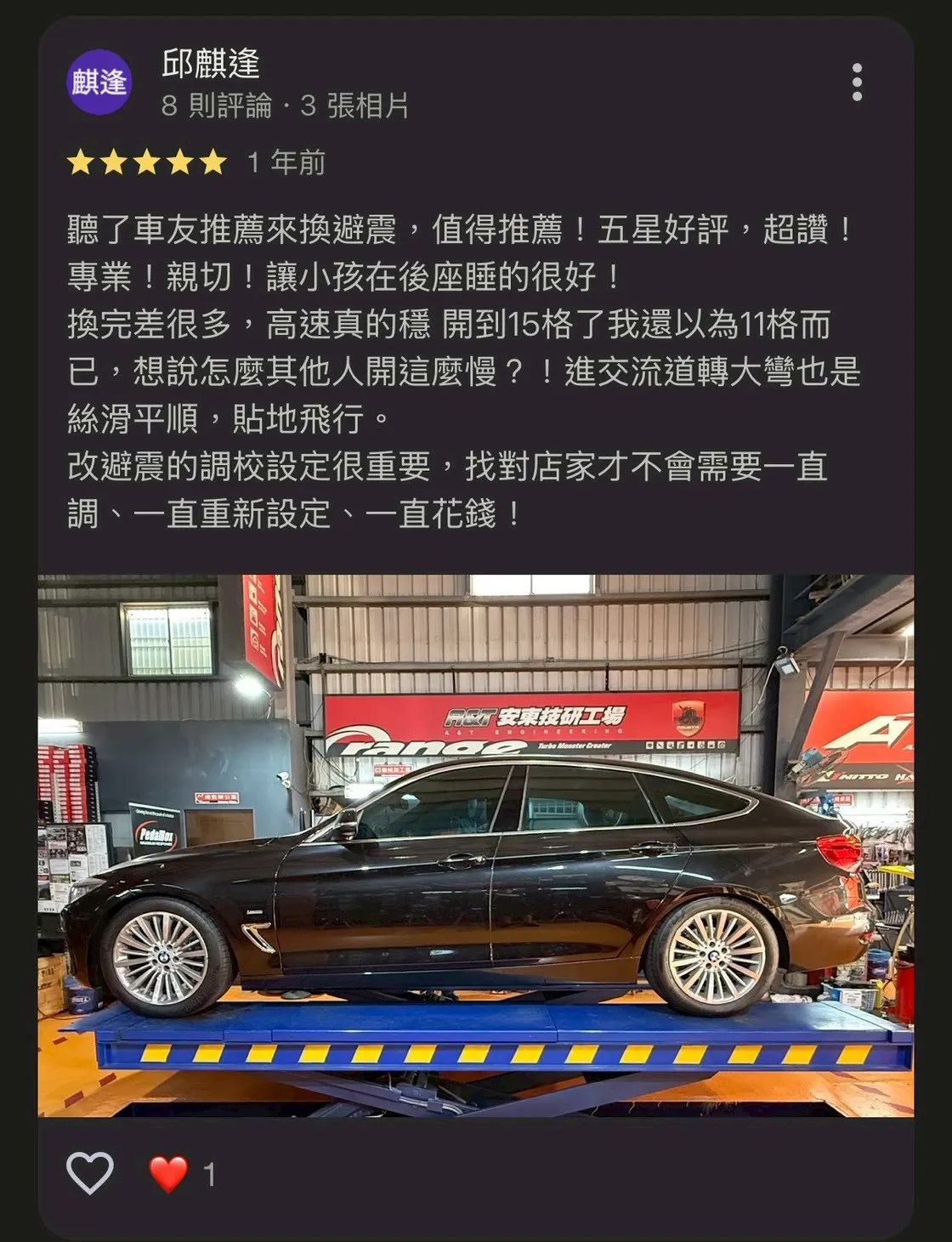 聽了車友推薦來換避震,值得推薦!五星好評,超讚!專業!親切!讓小孩在後座睡的很好!