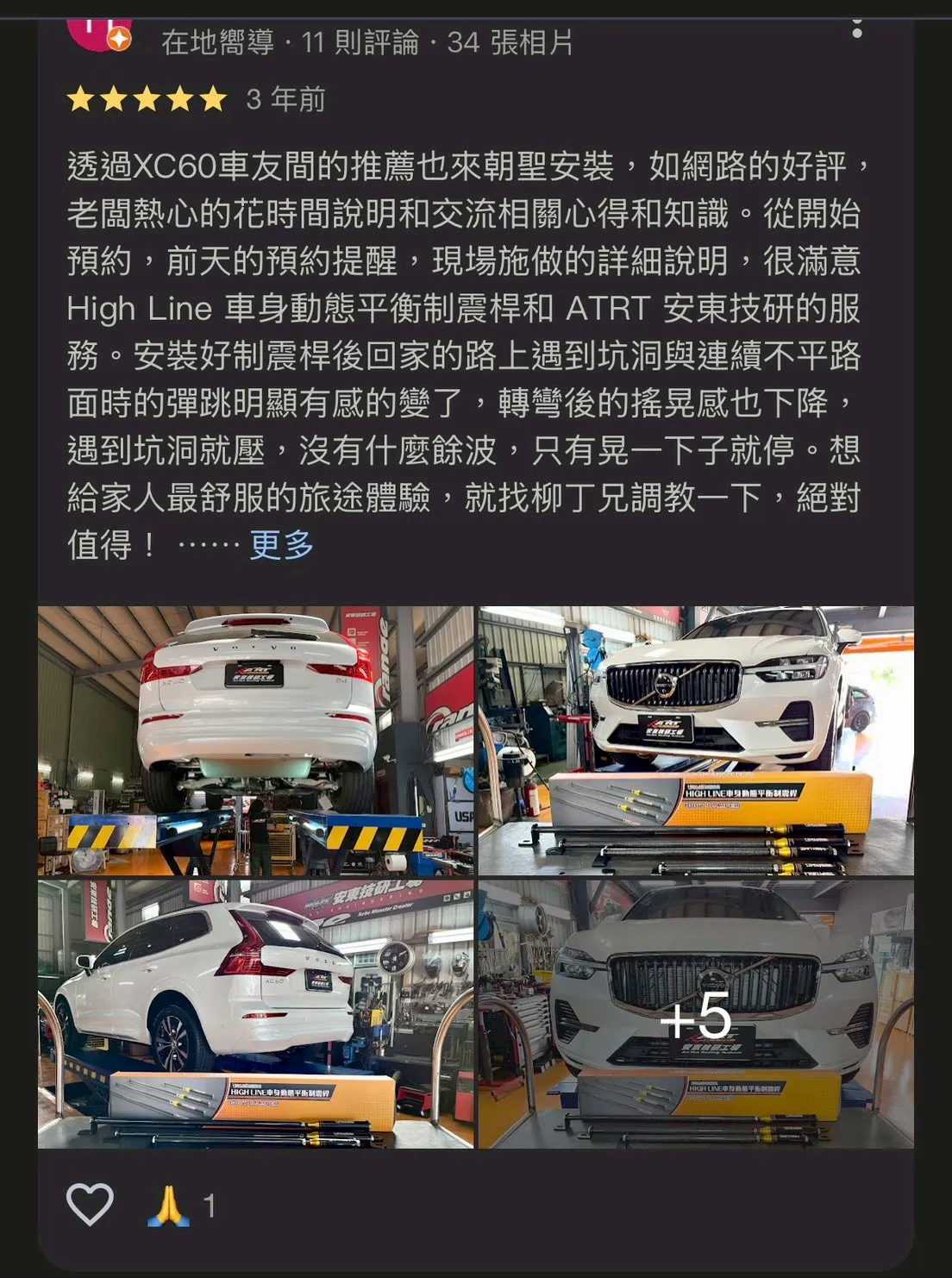 透過XC60車友間的推薦也來朝聖安裝,如網路的好評,老闆熱心的花時間說明和交流相關心得和知識。從開始預約,前天的預約提醒,現場施做的詳細說明,很滿意 High Line 車身動態平衡制震桿和 ATRT 安東技研的服務。安裝好制震桿後回家的路上遇到坑洞與連續不平路面時的彈跳明顯有感的變了,轉彎後的搖晃感也下降,遇到坑洞就壓,沒有什麼餘波,只有晃一下子就停。想給家人最舒服的旅途體驗,就找柳丁兄調教一下,絕對值得!