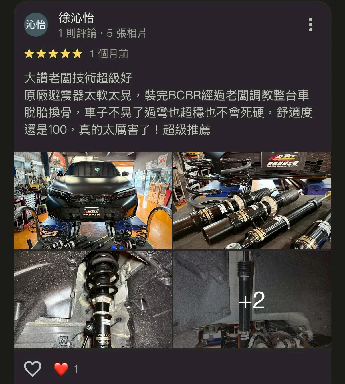 原廠避震器太軟太晃,裝完BCBR經過老闆調教整台車脫胎換骨,車子不晃了過彎也超穩也不會死硬,舒適度還是100,真的太厲害了!超級推薦
