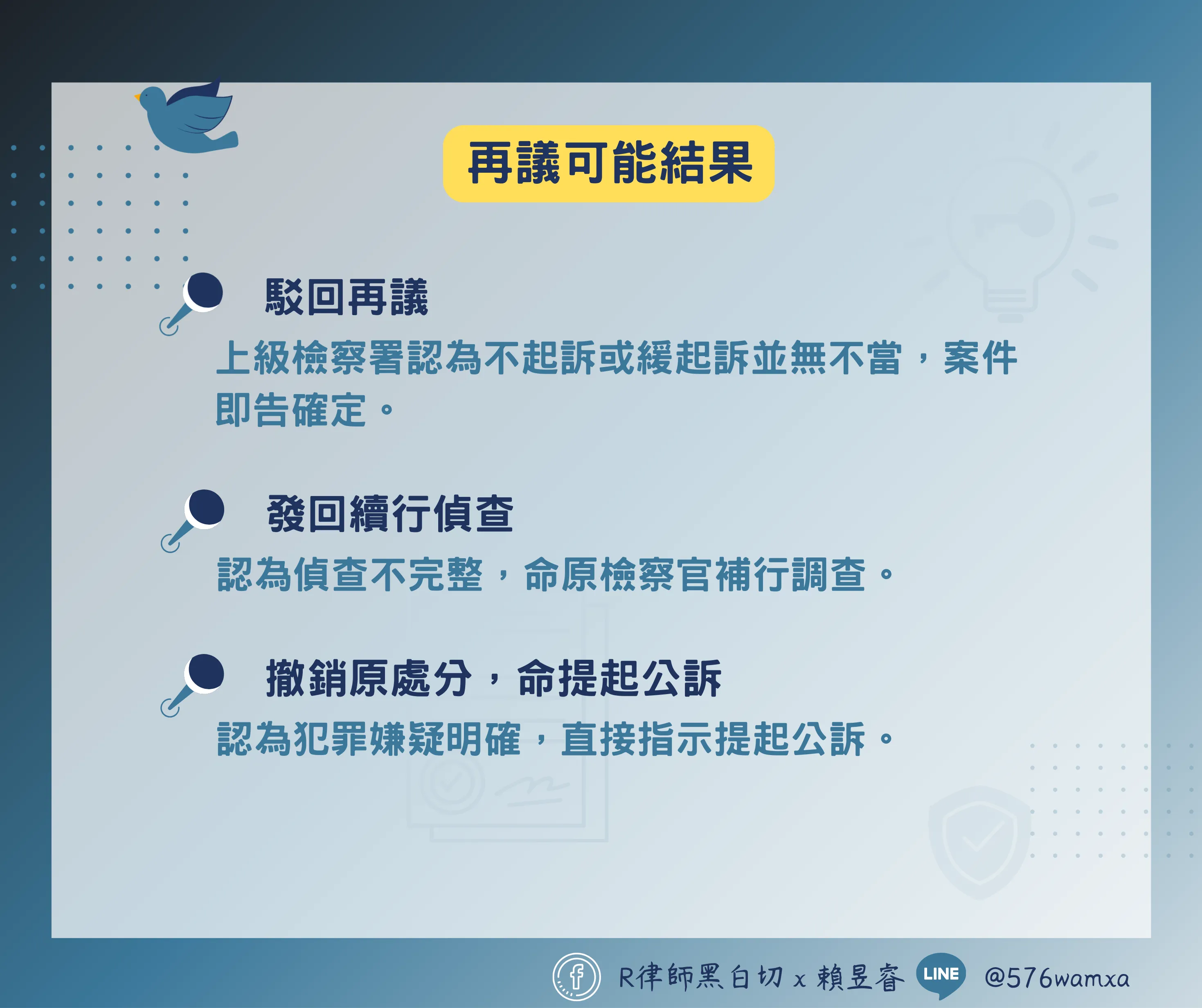 「再議」請高檢署檢察官重新檢視地檢署檢察官的不起訴處分與卷內相關事證,如果有事實調查不夠完備或是法律見解有適用法律錯誤的地方,高檢署檢察長就會將案件重新發回給地檢署,告知地檢署檢察官有什麼應該補充調查或是更正的地方,改由地檢署「另一位」檢察官續行偵查,決定是否要起訴、緩起訴,或是維持原本的不起訴處分。