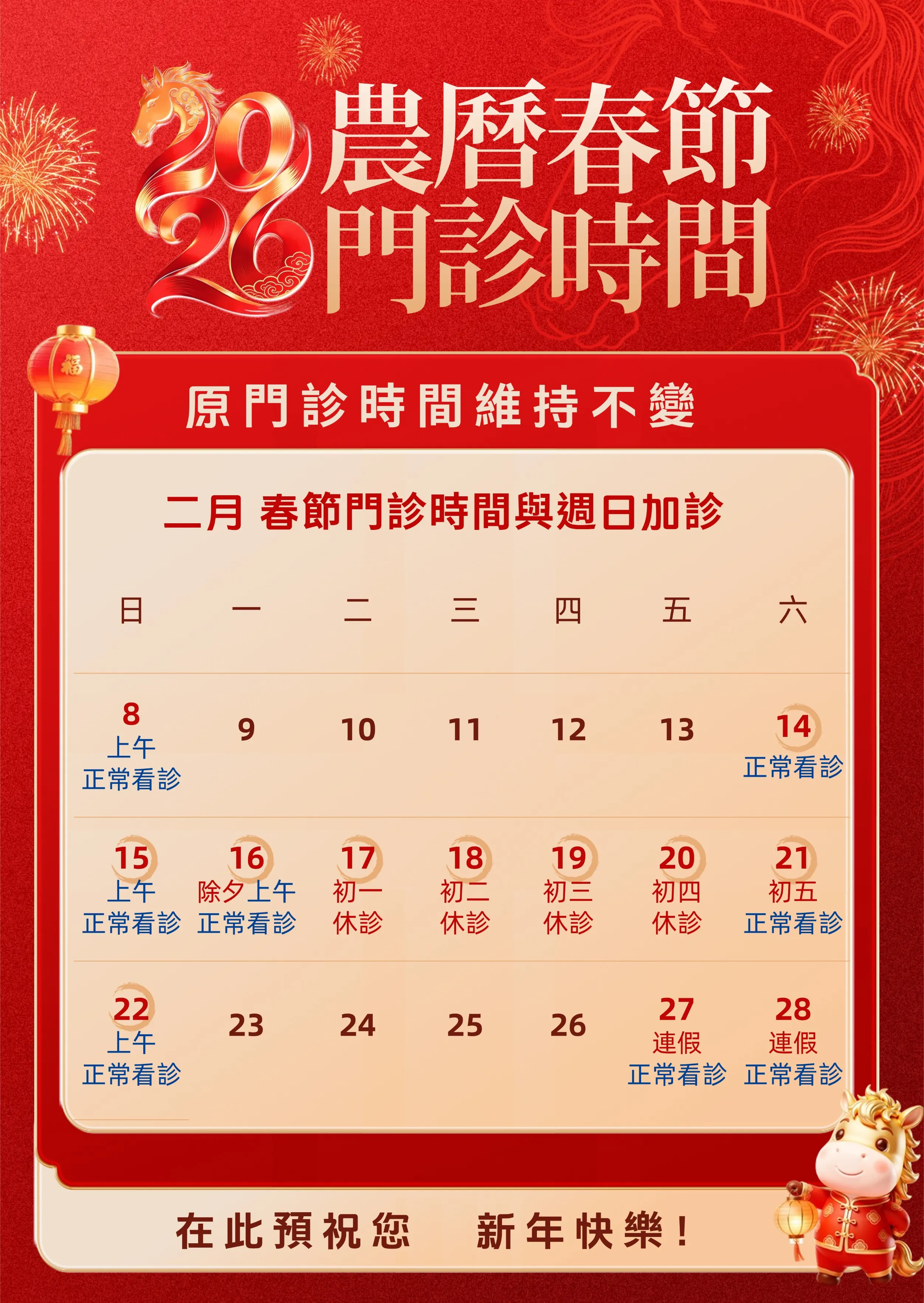 2/17(初一) ~ 2/20(初四):全日休診