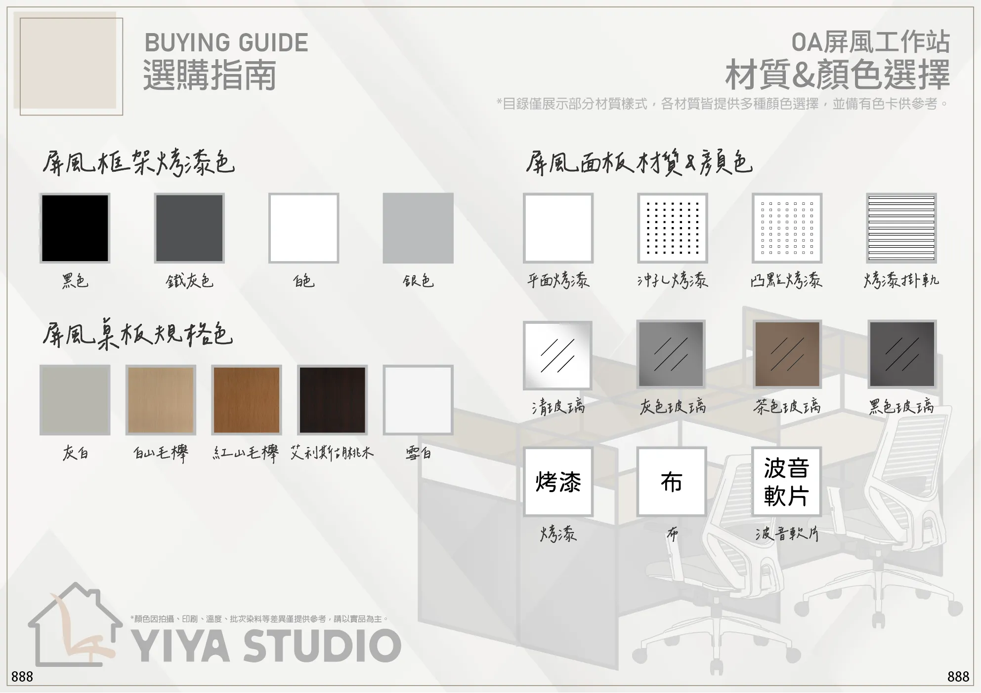 透過多樣材質與色彩的排列組合,可因應不同辦公室風格與空間條件,打造兼具機能性與美感的工作環境。