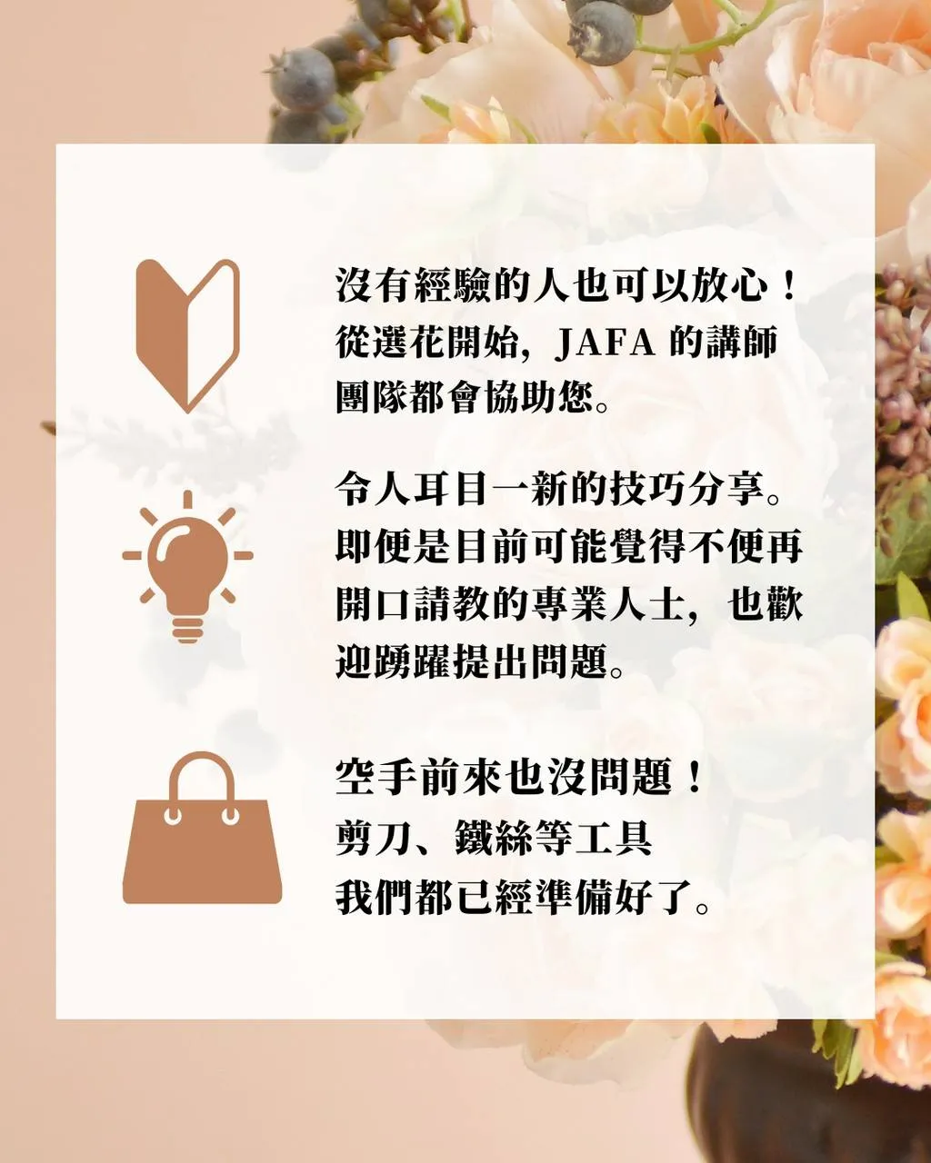 沒有經驗的人也可以放心!從選花開始,JAFA 的講師團隊都會協助您。令人大開眼界的技巧。即使是現在不好意思再問的專業人士,也請盡管提問。