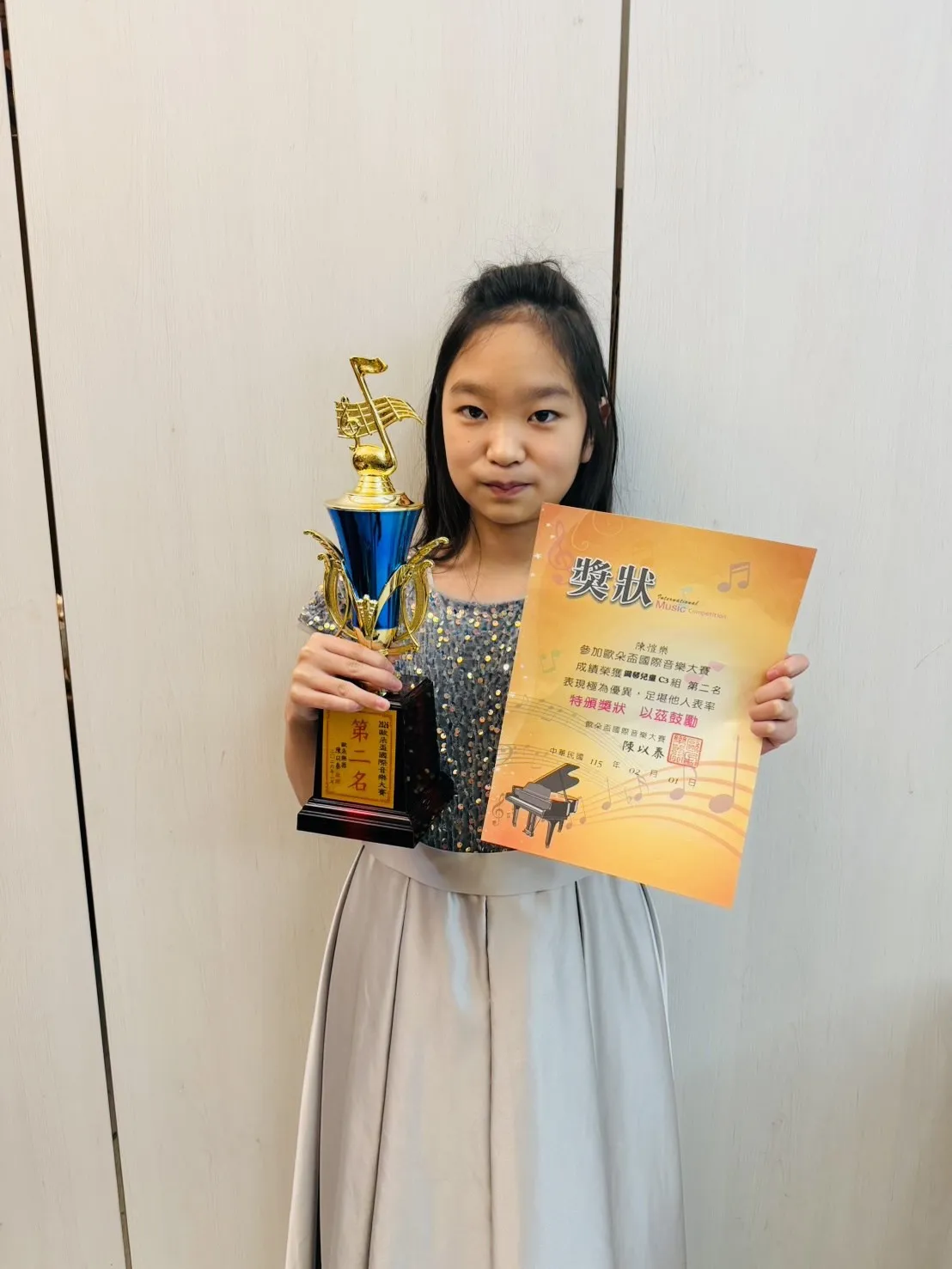 陳O樂 榮獲歐朵盃音樂大賽 古典鋼琴初階組 中年級 第二名