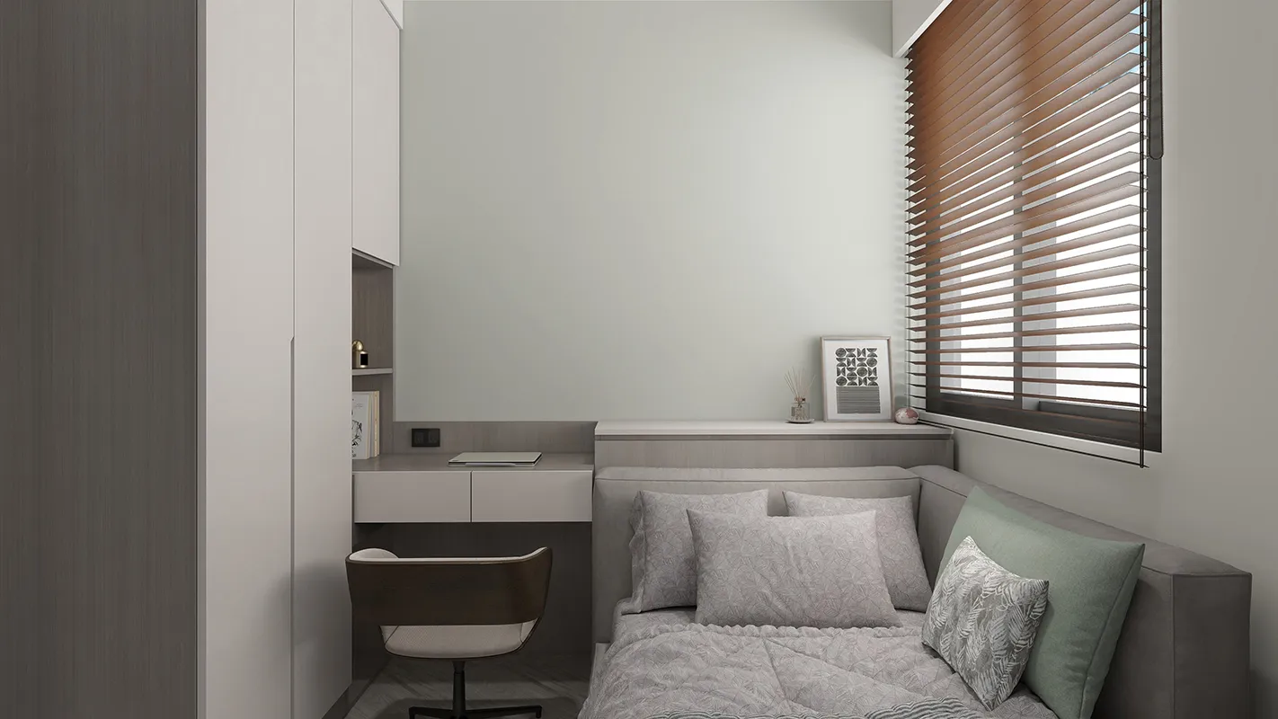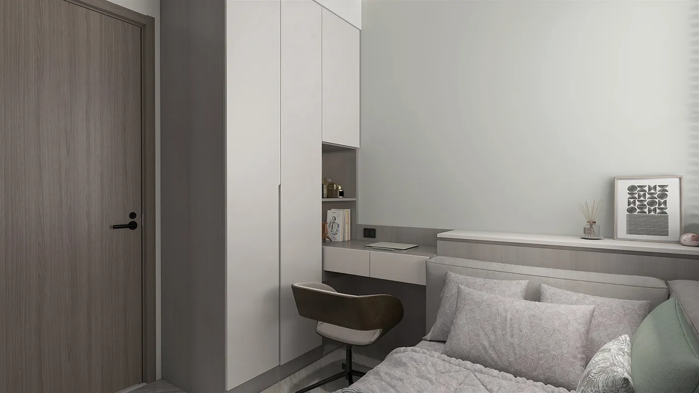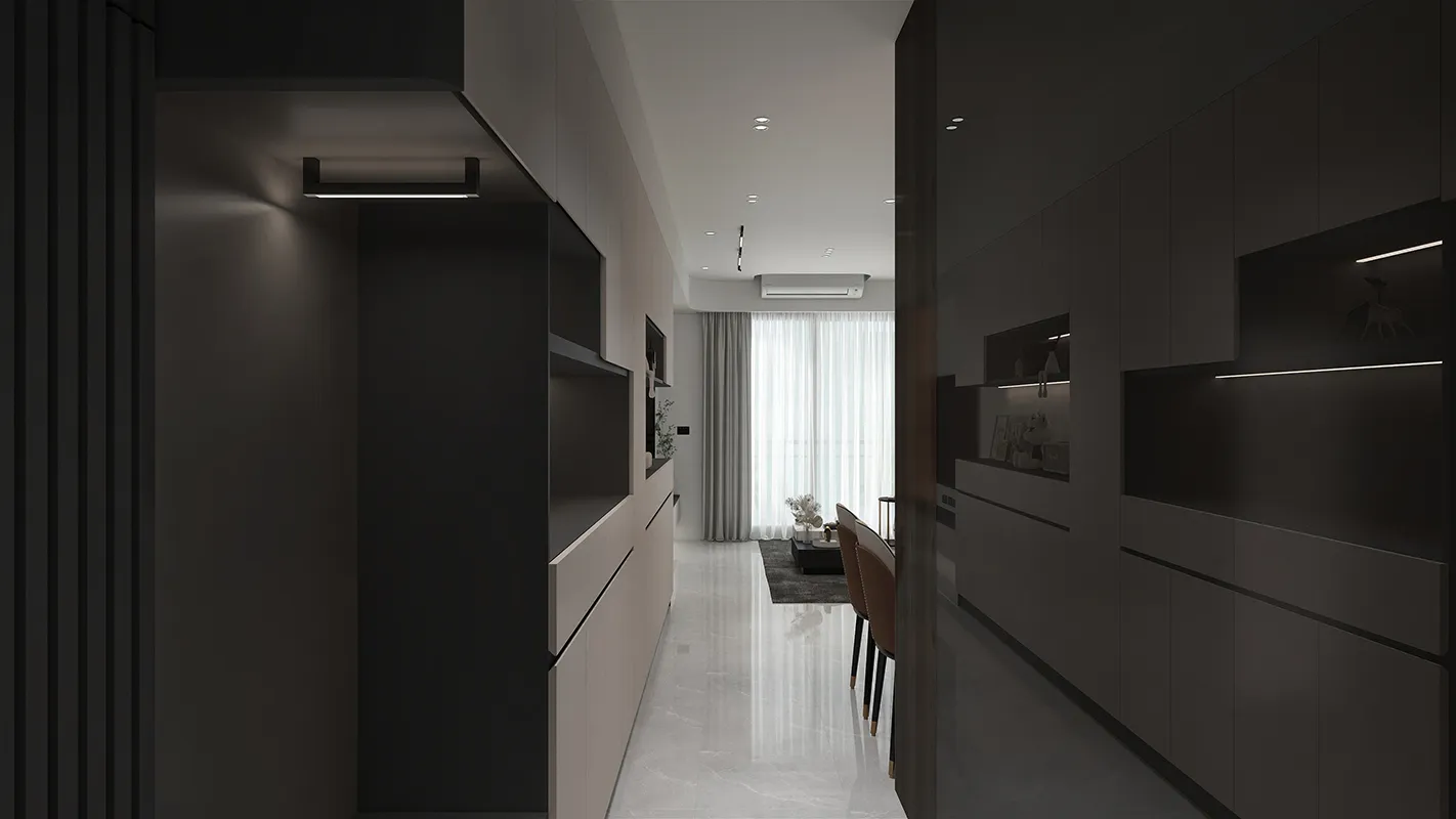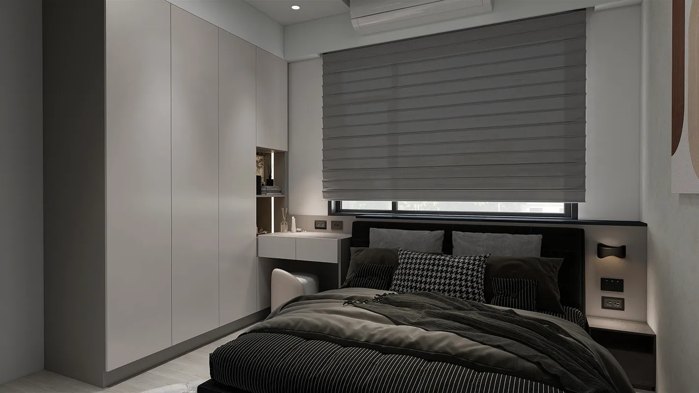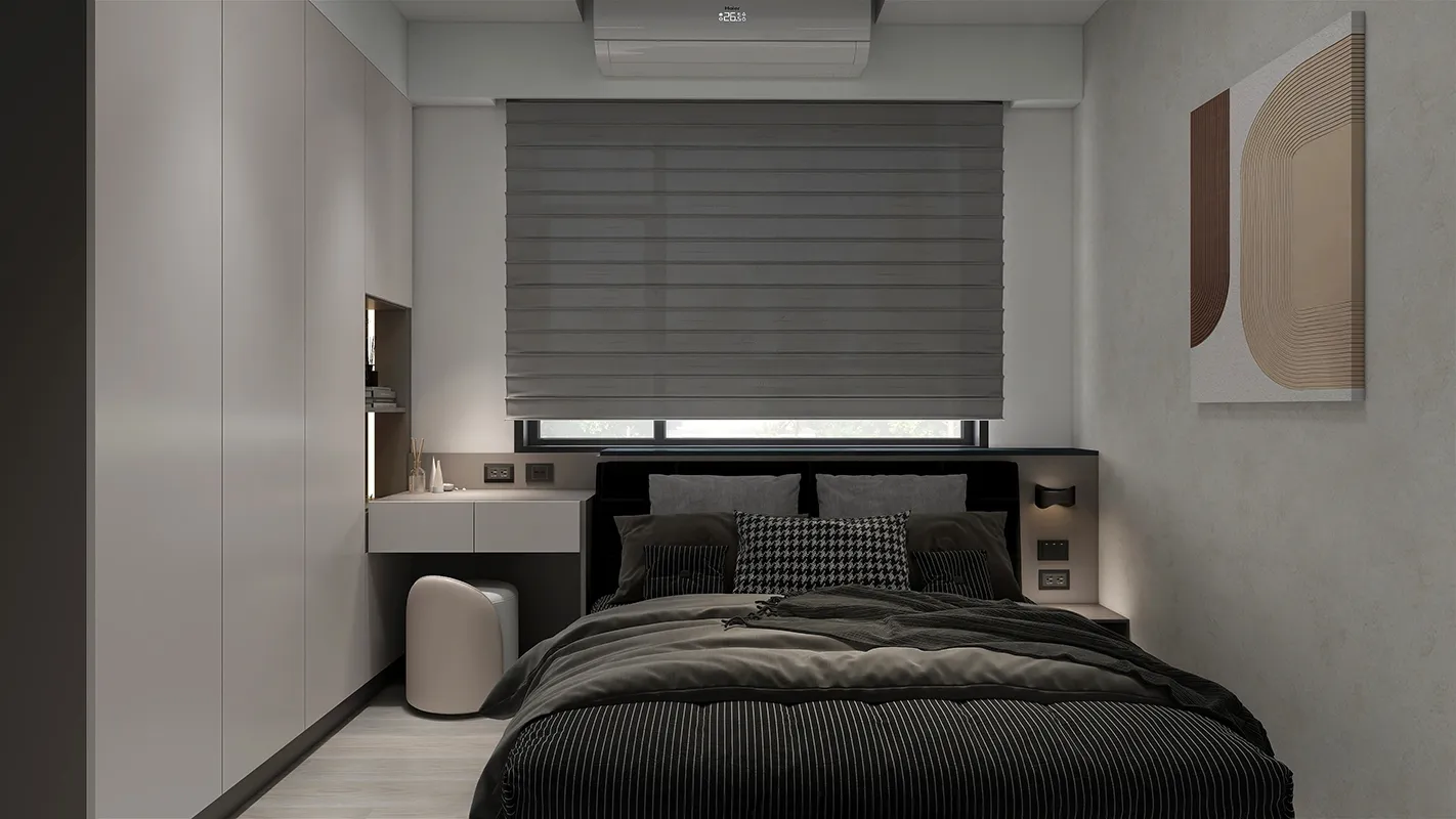 - 俐落線條與隱藏式設計: 設計強調簡潔的幾何線條,收納櫃採用隱藏式或線條簡練的設計,減少視覺雜亂感。