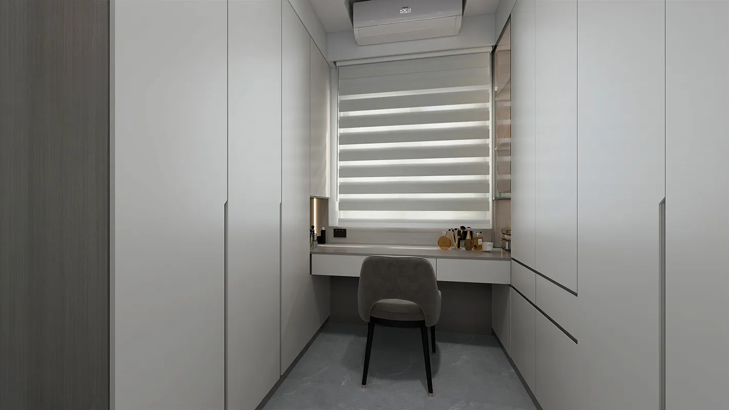 - 色彩搭配: 空間採用中性色調為基底,如白色、米色、淺灰色,營造出明亮、乾淨且平靜的氛圍。櫃體的深灰色點綴增加了視覺層次感。