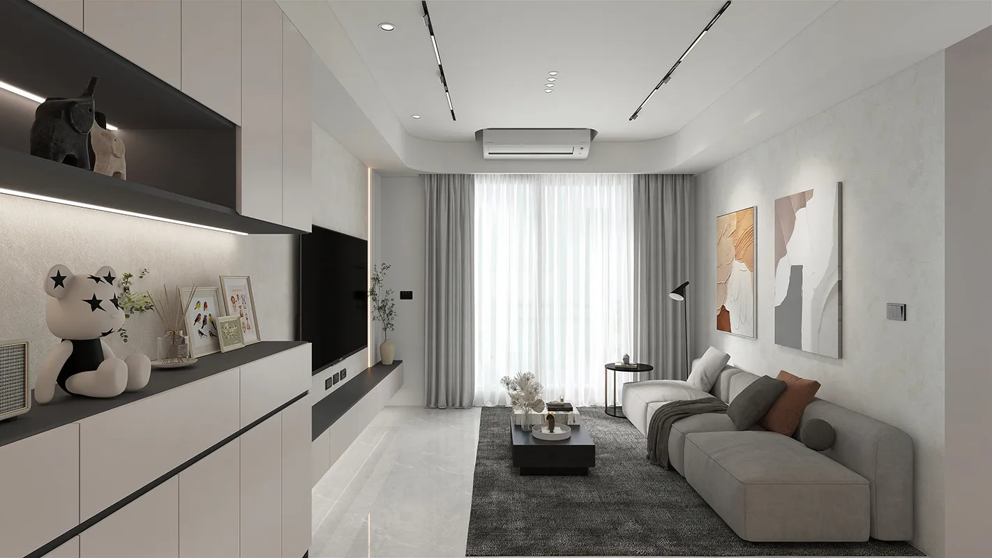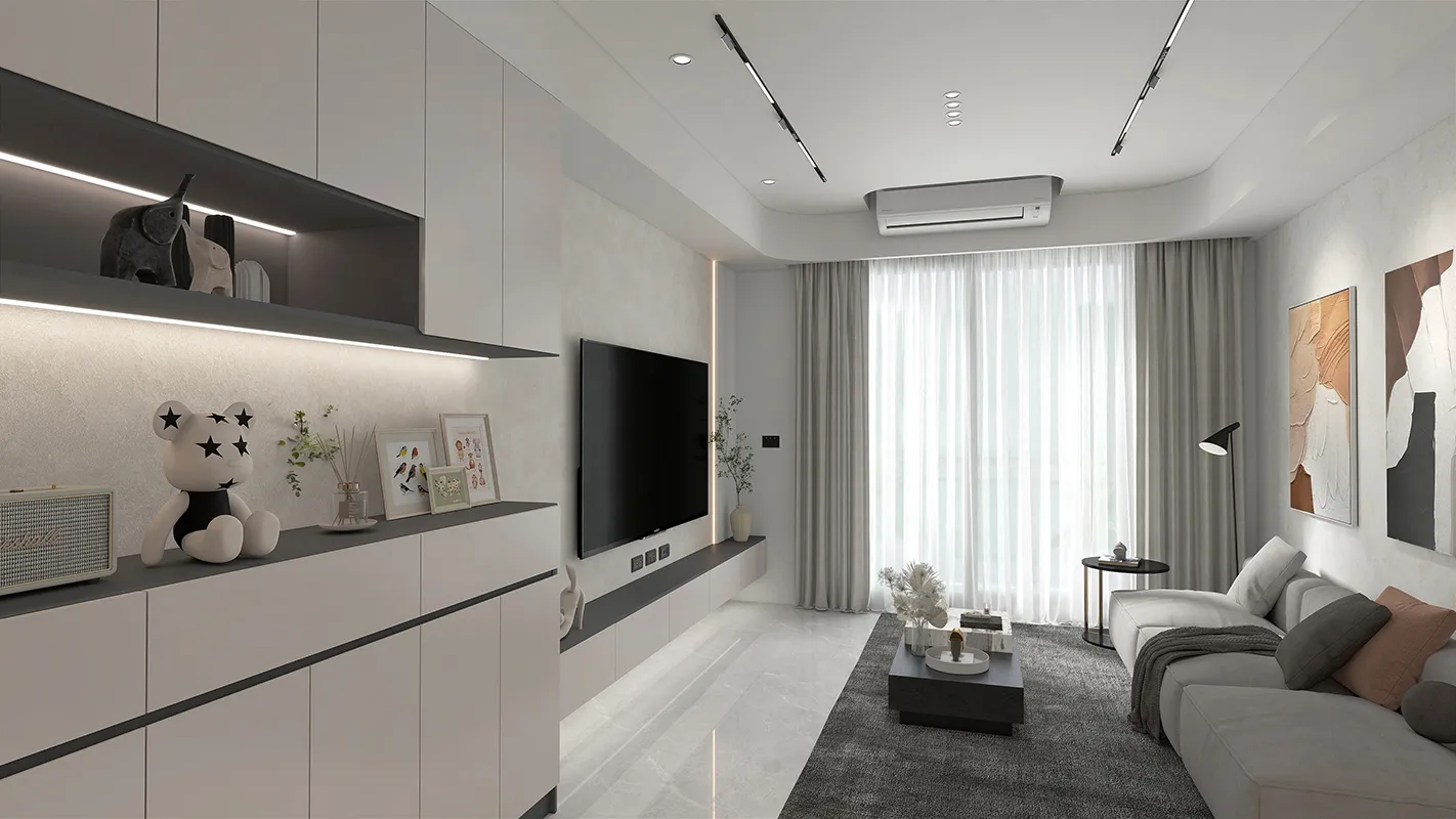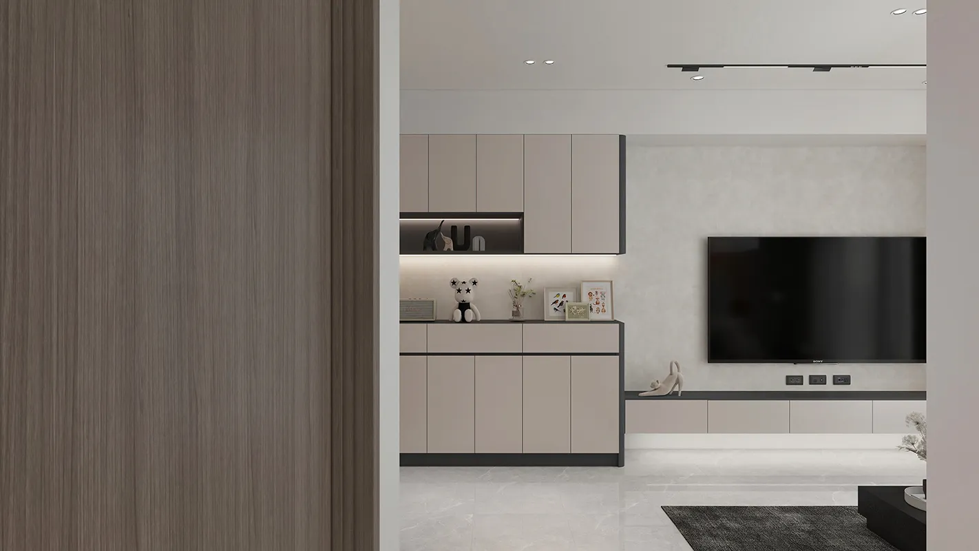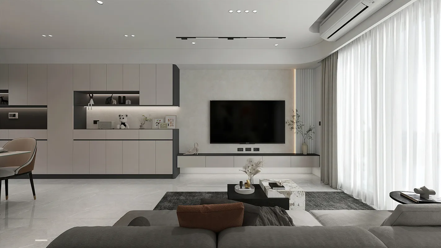 - 材質運用: 結合了不同材質來豐富空間質感,例如平滑的櫃體表面、柔軟的布藝沙發和地毯,以及可能在電視牆或檯面使用的石材紋理,營造低調的奢華感。