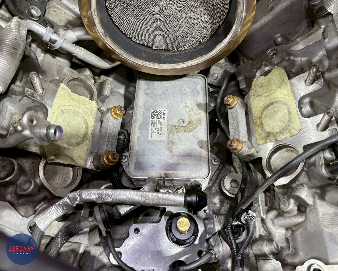 這台 Cayenne Coupe 同時面臨了漏水與漏油的雙重問題。經過技師拆解診斷,發現多處密封件與控制元件已故障失效,特別是隱藏在引擎深處的機油冷卻器與水泵浦。