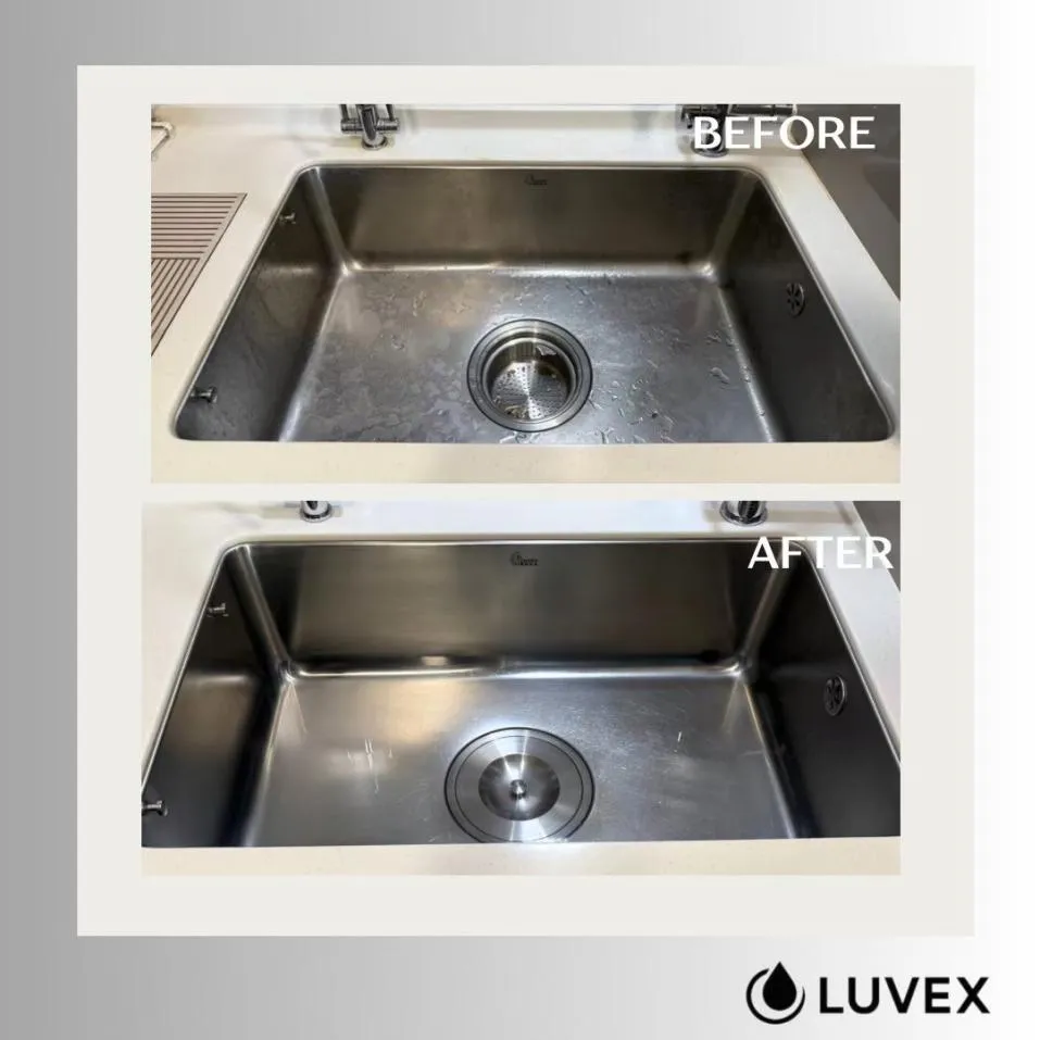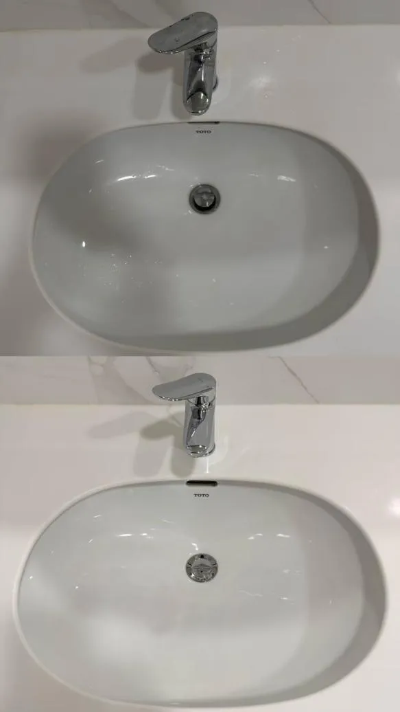 廚房部分,包含整體檯面、烤箱玻璃、抽油煙機及中島檯面皆進行鍍膜處理,可有效降低油汙附著,讓清潔更為省時省力;浴室部分則針對玻璃與五金全面施作,減少水垢與皂垢堆積,提升長期使用的便利性。