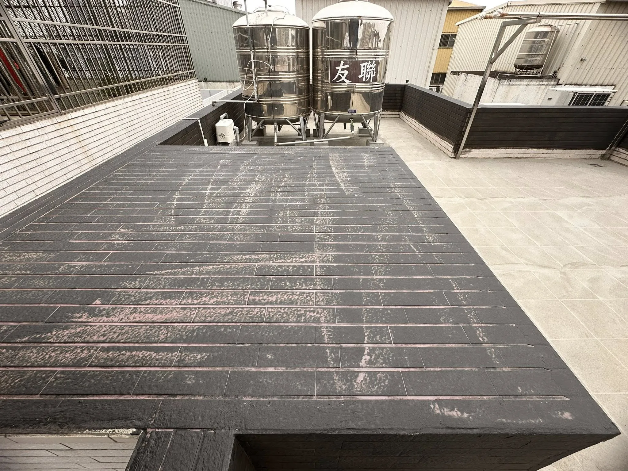#屋頂防水進行中 陽離子底漆  犀牛中塗彈泥。無機防水系統|台南防水工程|永康區防水工程