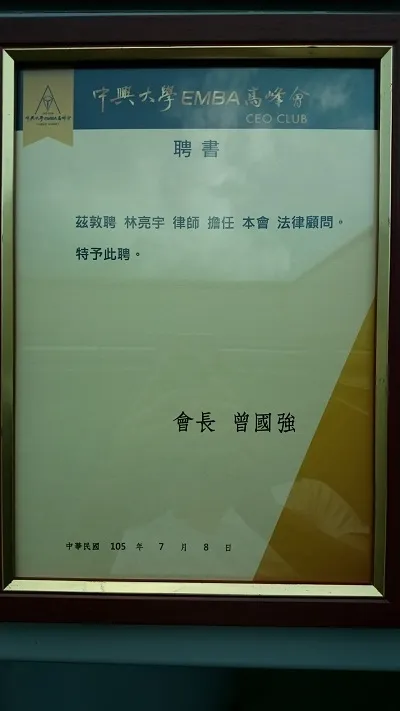真亮法律事務所所長林亮宇律師受邀擔任國立中興大學EMBA 高峰會 CEO CLUB法律顧問