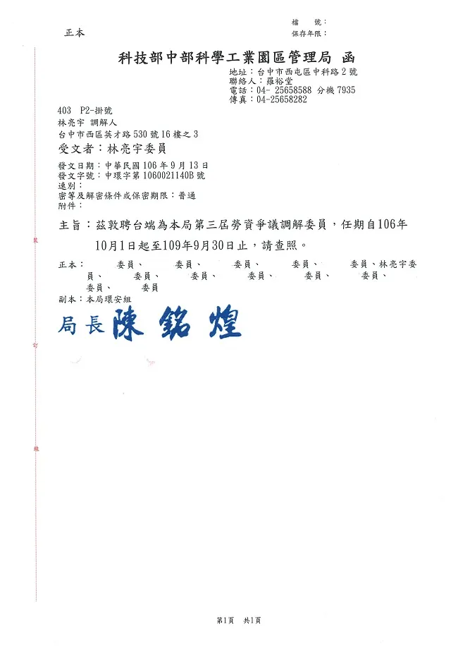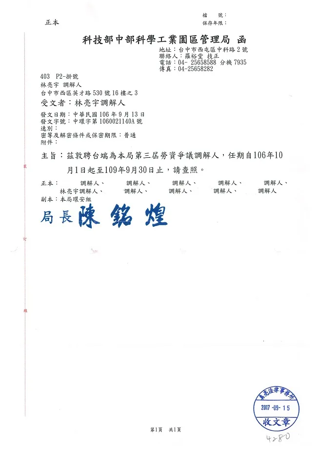 恭賀 真亮法律事務所所長林亮宇律師獲選為「科技部中部科學工業園區管理局」第三屆「勞資爭議調解人」與「勞資爭議調解委員」