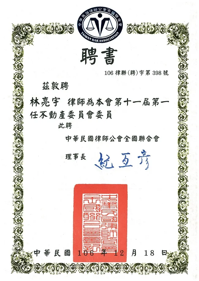 恭賀 真亮法律事務所林亮宇律師 獲選為「中華民國律師公會全國聯合會」第十一屆「第一任不動產委員會委員」