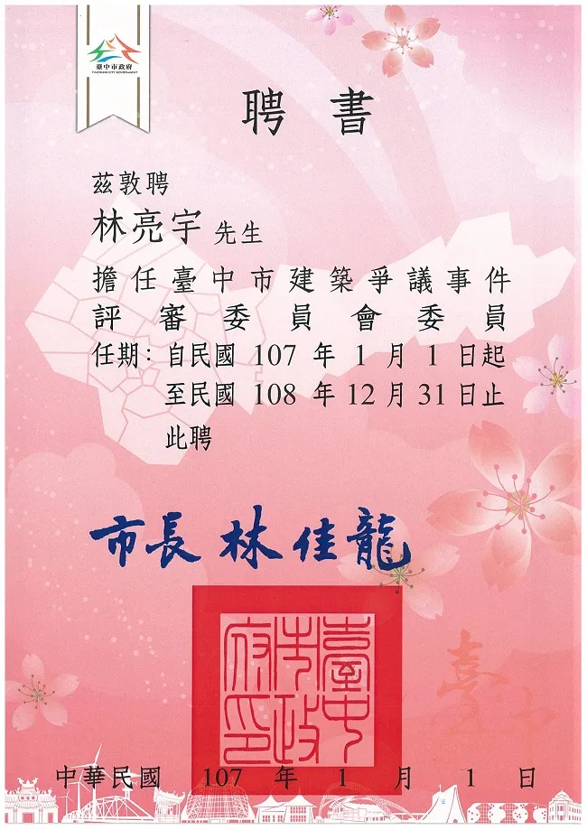 真亮法律事務所所長林亮宇律師,非常榮幸獲聘為「臺中市建築爭議事件評審委員會」之委員