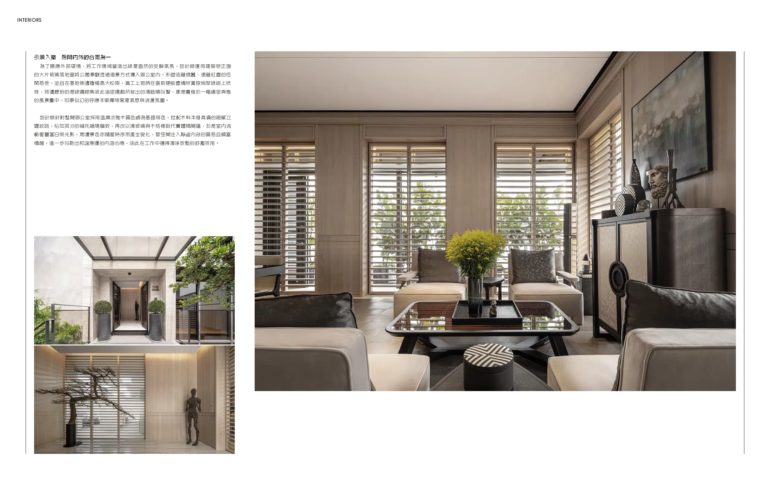 設計師針對整間辦公室採用溫潤淡雅木質色調為基礎用色,搭配木料本身具備的細膩立體紋路,恰如其分的襯托職場韻致,再改以清玻璃與木格柵取代實體隔間牆,於是室內流動著豐富日照光影,周遭景色亦隨著時序而產生變化,替空間注入靜謐內斂的質感且饒富情趣,進一步勾勒出和諧無擾的內涵心境,由此在工作中獲得清淨放鬆的舒壓效用。