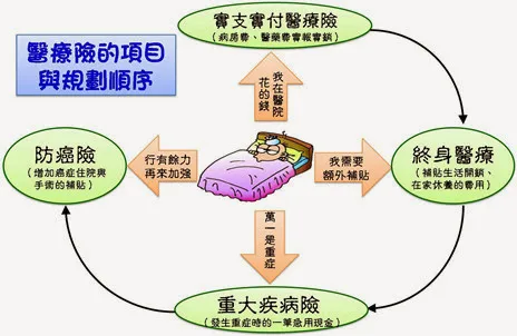 上述的實支實付醫療險以及定額給付之醫療險均為規劃醫療險時之基本組合;在這兩樣基本配備都具備之後,為了使我們自己在醫療照護上能更加完整且足夠,保險碩士會再建議讀者在行有餘力之餘,千萬要再替自己增加重大疾病以及防癌保險的規劃。關於各險種的規劃依據以及額度的安排將有專章再替各位進行介紹,底下先以簡單的圖示來說明整體醫療險的規劃概念: