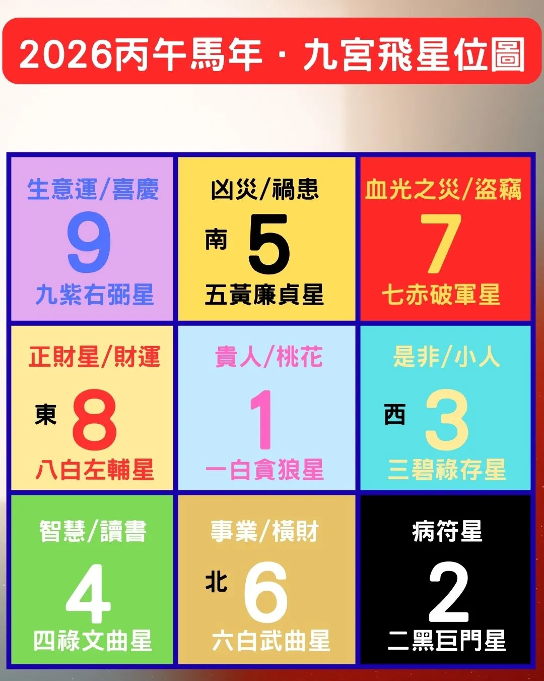在規劃 2026 日常佈置時,請特別注意正南方(五黃煞)與西北方(病符位)。這兩個方位建議保持: