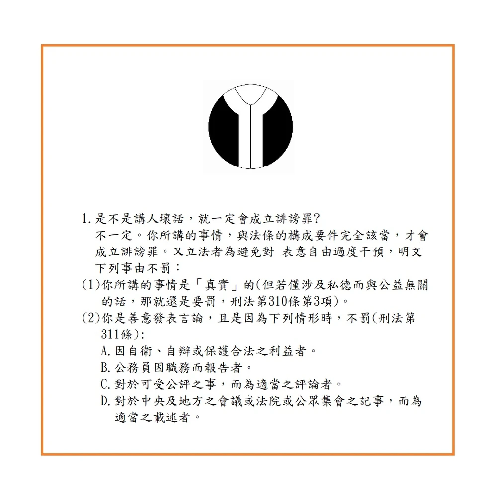 又如你是善意發表言論,且是因為下列情形時,也不罰(刑法第311條):