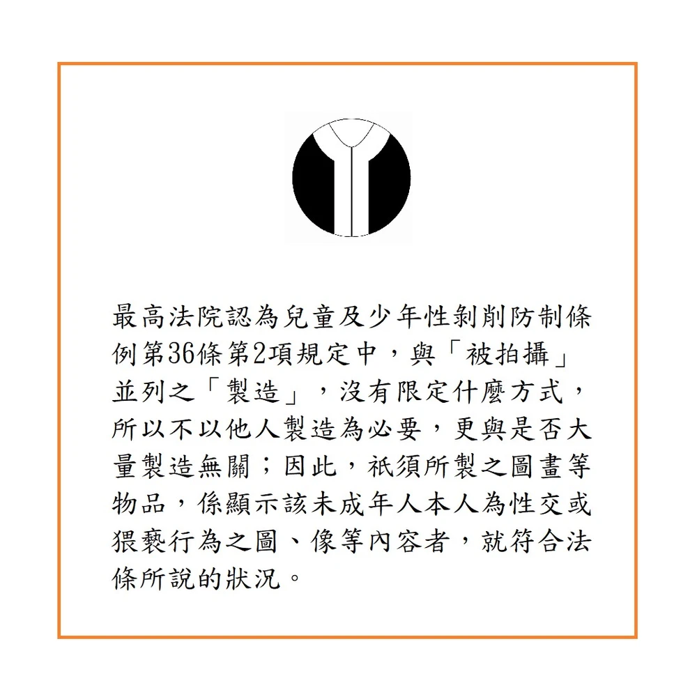 最高法院認為條文中與「被拍攝」並列之「製造」,沒有限定什麼方式,所以不以他人製造為必要,更與是否大量製造無關;因此,祇須所製之圖畫等物品,係顯示該未成年人本人為性交或猥褻行為之圖、像等內容者,就符合法條所說的狀況。而自行拍攝照片或影片,係屬創造照片或影片之行為,應在該條項所稱「製造」之範疇內[註1]。