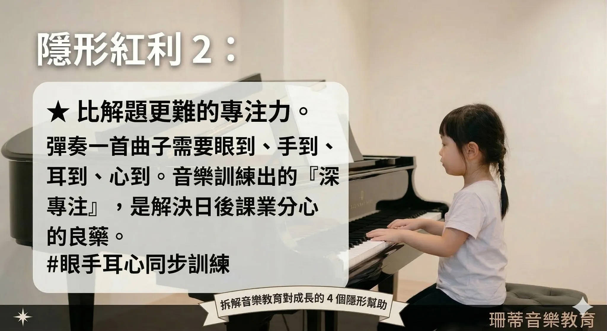 比起3C, 電視上的碎片資訊,彈奏鋼琴需要眼、手、耳、心同步訓練。這種「深專注力」的習慣一旦養成,孩子回到課業上也能更快進入狀態,不被輕易分心。
