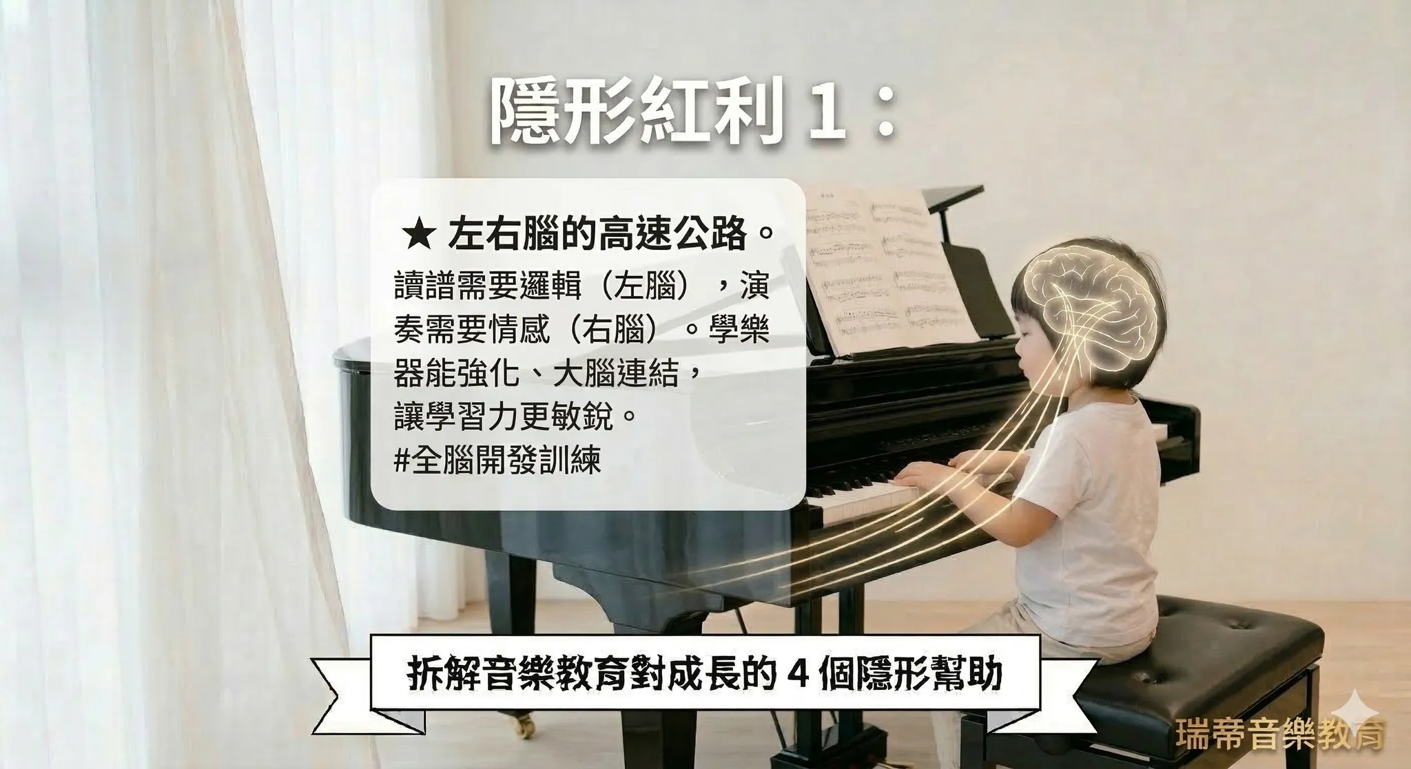 兒童階段是邏輯發展的黃金期。讀譜需要左腦邏輯,演奏需要右腦情感。頻繁切換能強化大腦連結,讓孩子在面對學科學習時,思維更敏捷、更具備組織力。