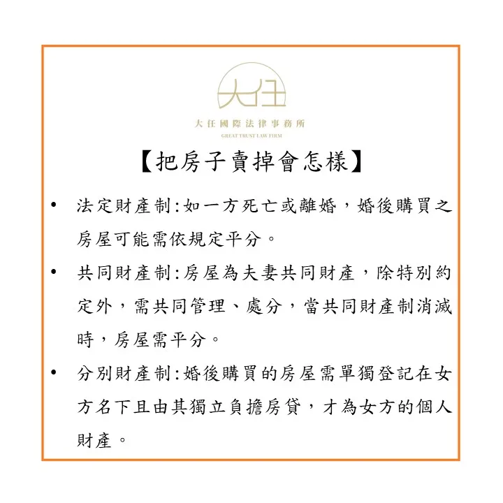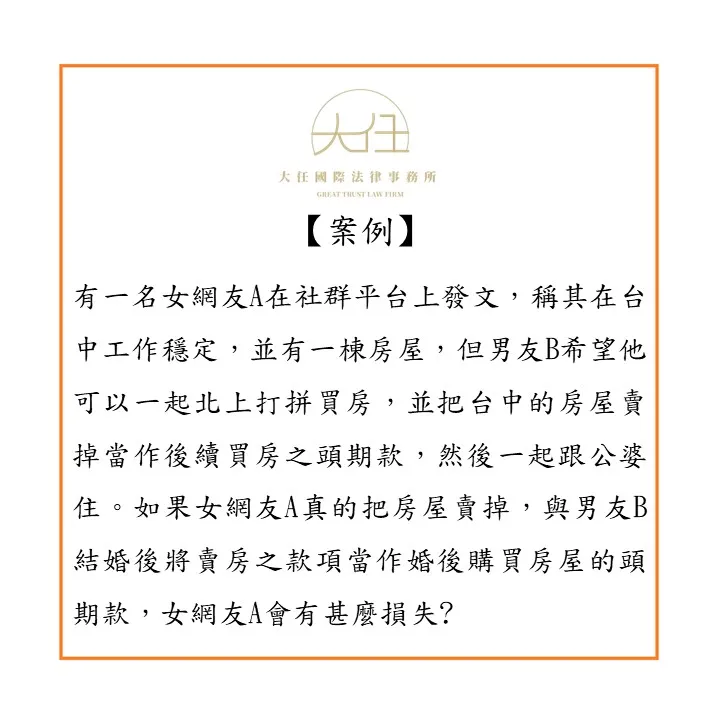 若女網友A把她在台中的房屋賣掉,與男友B結婚後將該款項當作婚後購買房屋的頭期款,依「法定財產制」規定,該房屋為婚後財產,要是因為一方死亡或離婚等法定財產制解消事由,該婚後購買之房屋有可能需要與男網友B依夫妻剩餘財產分配之規定平分2分之1;若為「共同財產制」,該房屋會變成夫妻之共同財產,除有特別約定外,該房屋由夫妻共同管理、處分,且當共同財產制消滅時,婚後之共同財產即該房屋需與男網友B平分;倘為「分別財產制」,除非房子單獨登記在女網友A名下,且由女網友A負擔房貸,否則該房屋仍為其與男友B之財產。