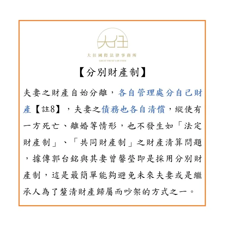 「分別財產制」為夫妻之財產自始各自分離,各自管理處分自己之財產【註8】,夫妻之債務也以各自財產清償,因此縱使有一方死亡、離婚等情形,也不發生如「法定財產制」、「共同財產制」之財產清算問題,據傳郭台銘與其妻曾馨瑩即是採用分別財產制,這是最簡單能夠避免未來夫妻或是繼承人為了釐清財產歸屬而吵架的方式之一。